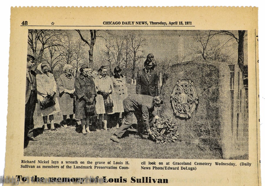 another important gravestone, not far from sullivan, marks the resting place of architectural photographer and preservationist, richard nickel, who lost his life salvaging ornament from adler & sullivan’s chicago stock exchange building in 1972. nickel is known for his relentless efforts documenting and preserving the work of louis sullivan during the 1960’s at the height of urban renewal, when scores of older buildings (including several adler & sullivan-designed residential and commercial structures) were being demolished across the city.