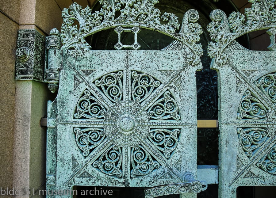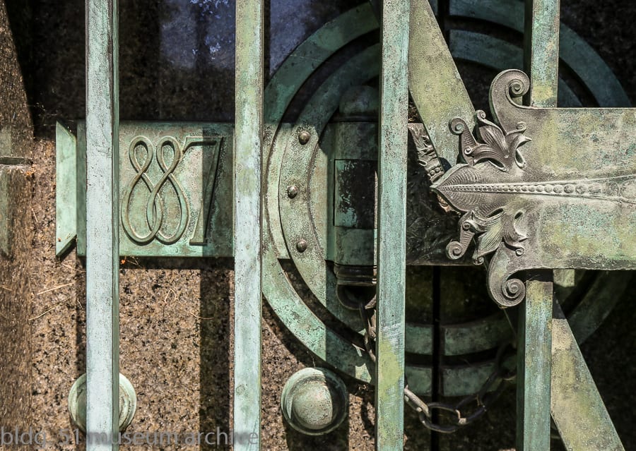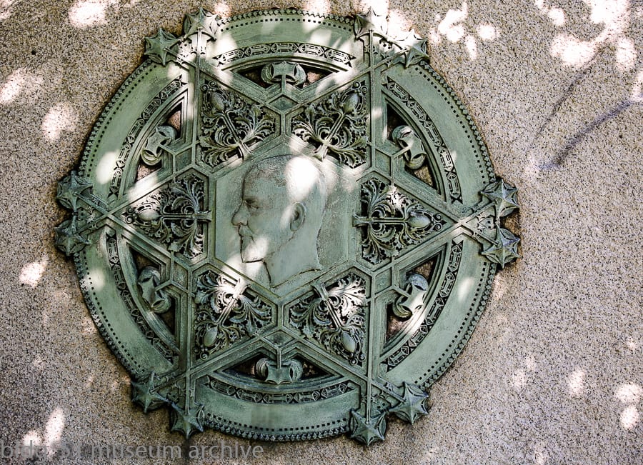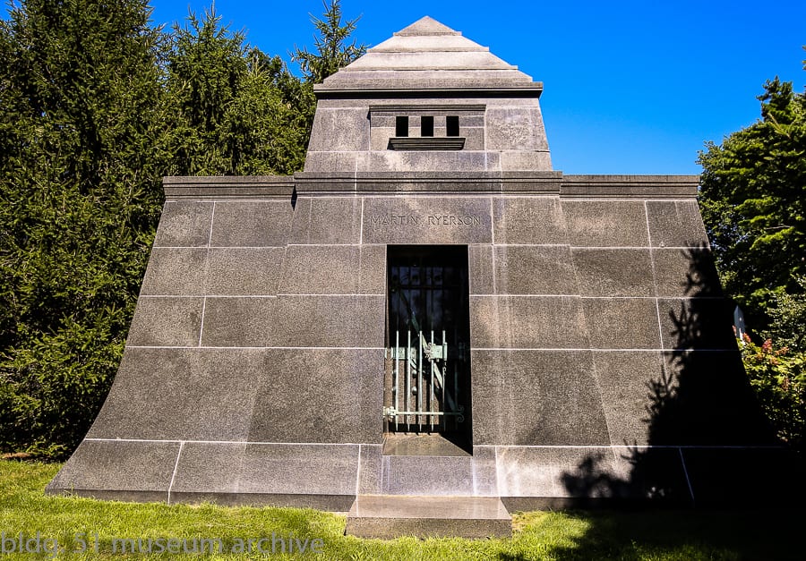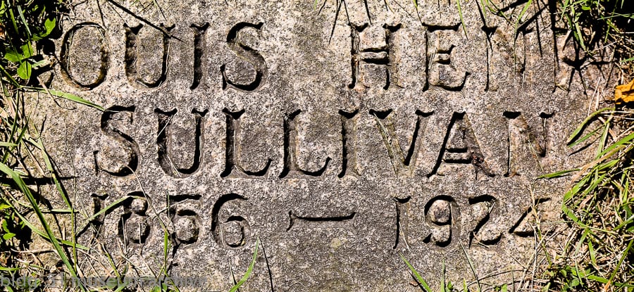 sullivan designed what are perhaps two of the most significant tombs in graceland cemetery. this included the carrie eliza getty tomb, commissioned in 1890 by lumber baron henry harrison getty for his wife (see cover photo detail), and an egyptian revival style mausoleum built for lumber baron and real estate speculator martin ryerson, commissioned by his son martin ryerson jr. in 1887 and completed in 1889. quite ironically, sullivan’s own grave marker was originally quite utilitarian and plain. thankfully though, five years later in 1929, his headstone was “upgraded” when architect thomas e. tallmadge designed a massive boulder, adorned with an inscription on one side and a marvelous cast bronze medallion on the other. inset onto the stone, it features one of sullivan’s own designs with his profile in the center.