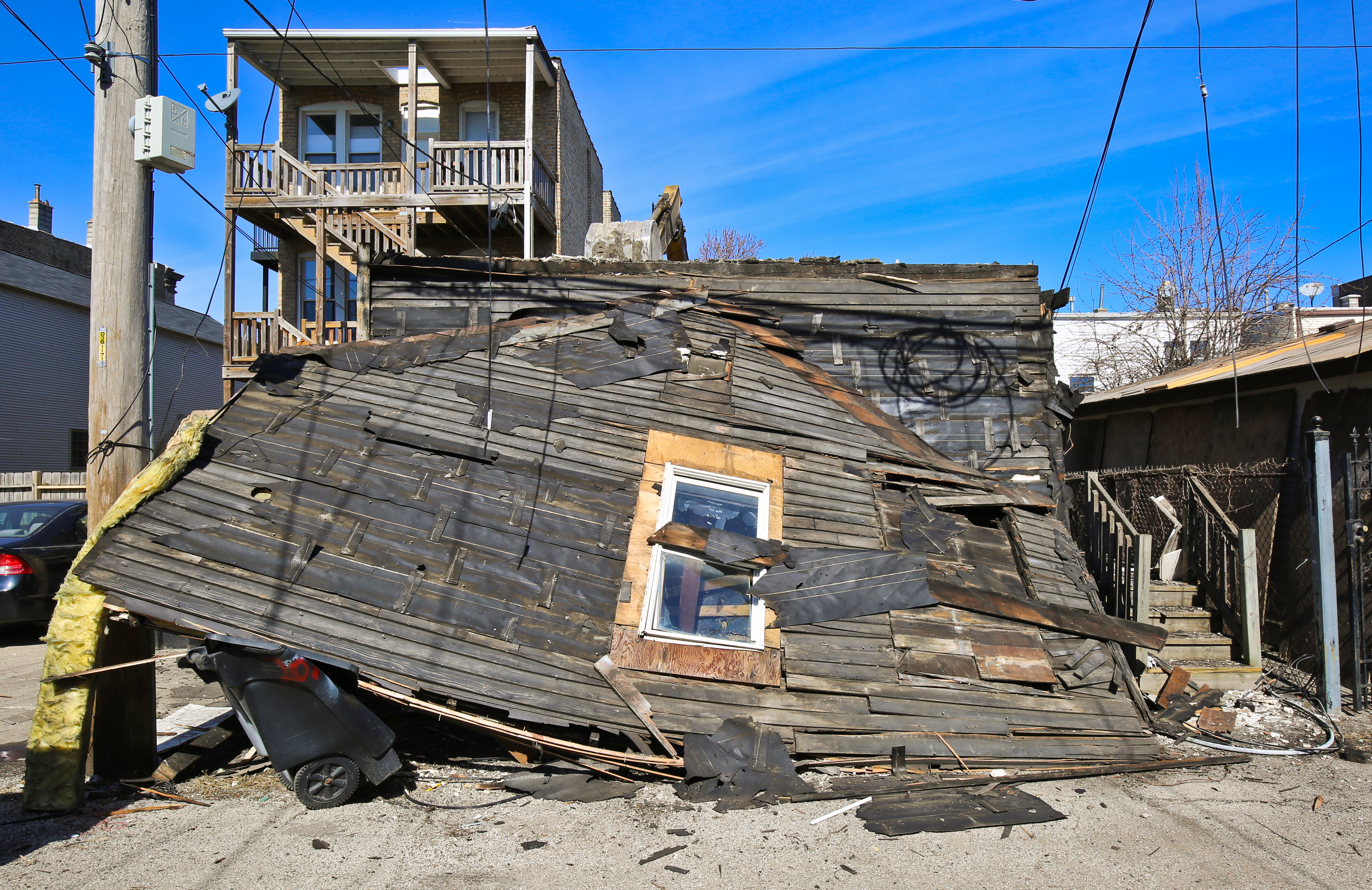 the top half of the cottage quickly split apart and slid forward into the alley when the studs mortised into the second story girt snapped. if i had the time and resources, i would have salvaged that “system” for further study. i recall the sheathing being incredibly irregular and massive in size – consistent with the building materials and methods used in the construction of these cottages during the mid-19th century.