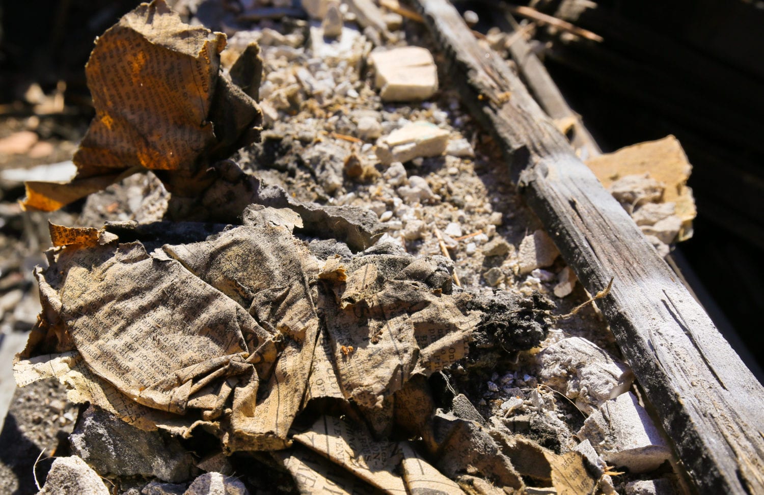 in a matter of two hours, the pre-fire cottage was flattened and trucked off to the landfill. note the crushed garbage can.