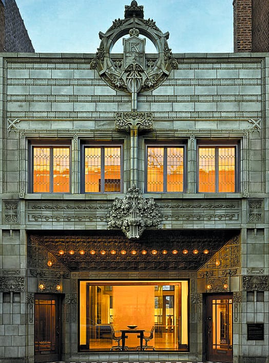 completed in 1922, the krause music store was the final building commission of notable chicago architect louis h. sullivan, who designed 126 buildings, with the great majority built during his partnership with dankmar adler. the krause music store’s facade is bedecked with a remarkable glazed terra cotta treatment, consisting of curvilinear and/or strongly organic design motifs surrounding a deeply setback and centrally located street level plate glass storefront window, flanked by two doors positioned inward. the recessed space is illuminated at night with several incandescent bare bulb fixtures built within terra cotta panels running horizontally above the large plate glass picture window. the building’s elaborate facade features two sets of leaded glass windows divided on the second floor by a slightly protruding column with a burst of foliage at the bottom and an oversized cartouche at the very top that exceeds the roofline. the circular-shaped cartouche is punctured with large openings surrounding a centrally located shield bearing the letter “k” for krause.