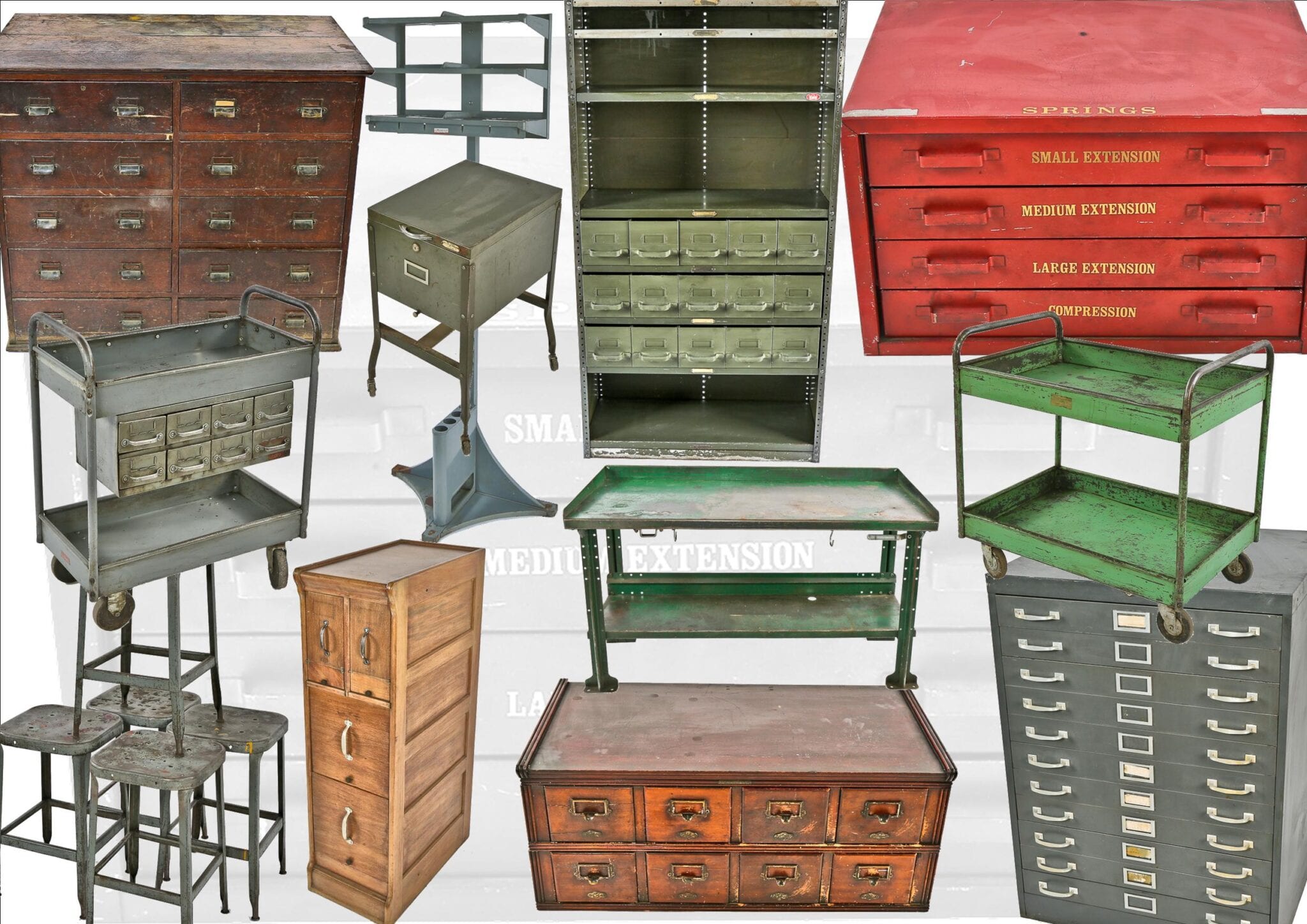 11 Oct vast assortment of vintage american industrial furniture salvaged from zim mfg. company factory