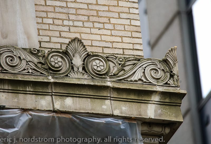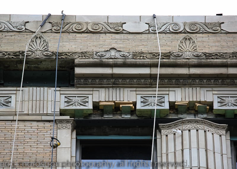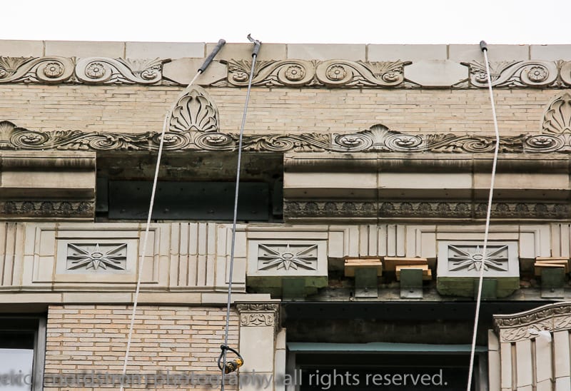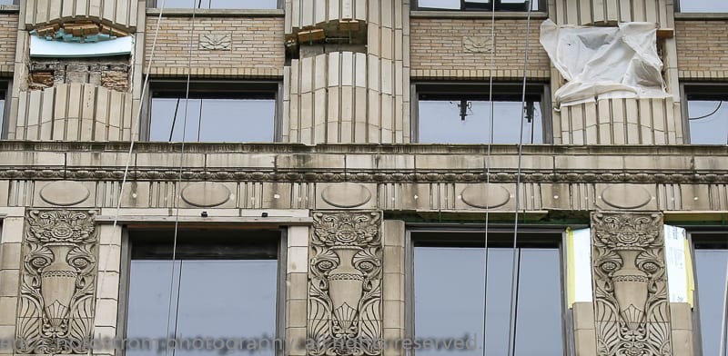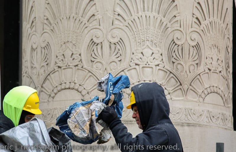i continue to document historic buildings undergoing restoration/renovations in chicago’s downtown at a feverish pace. i’ve noticed there is little – if any – public attention directed at the “sky boys” who spend their days working high above on scaffolding replacing, repairing, and recreating terra cotta and stone ornament that has succumbed to the unforgiving freeze-thaw cycles over the years.