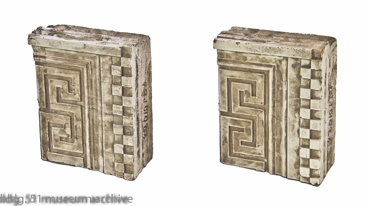 matching set of original interior neoclassical style terra cotta blocks salvaged from the railway exchange building atrium during restoration. the greek key and checkered border were motifs used on both the building’s exterior and interior. courtesy of the bldg. 51 artifact museum.