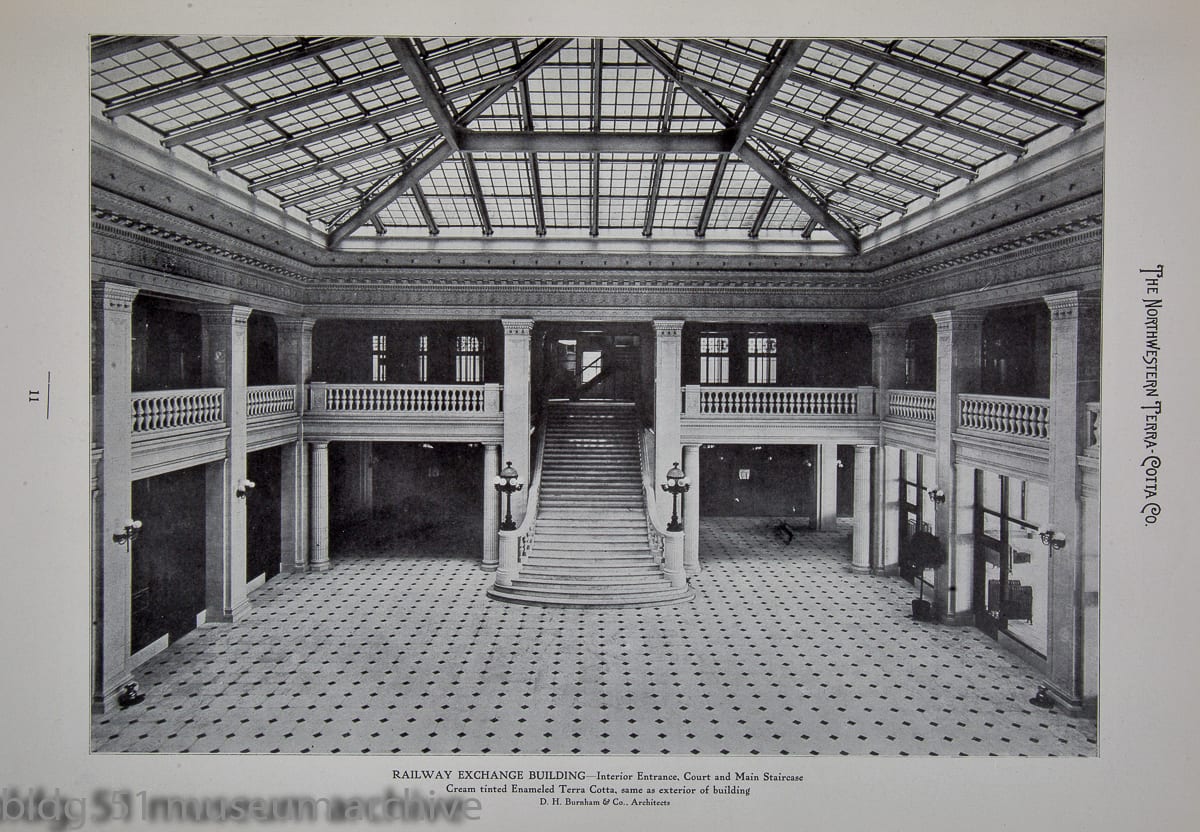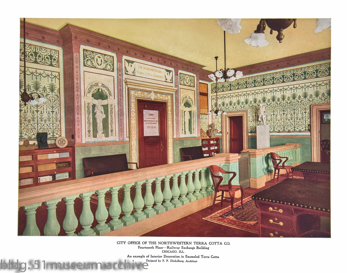 richly colored full plate (from catalog) image of northwestern’s office – located in the railway exchange building. the burnham & company-designed building was outfitted with terra cotta on the outside and interior atrium.