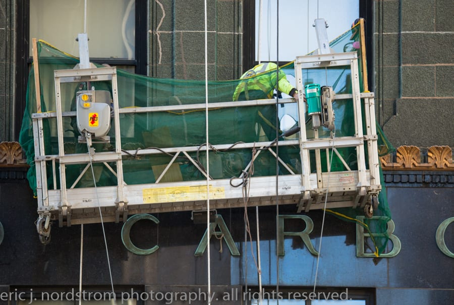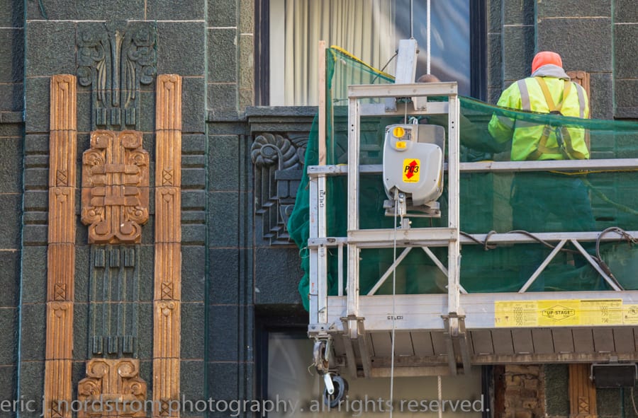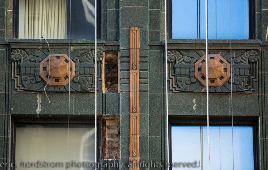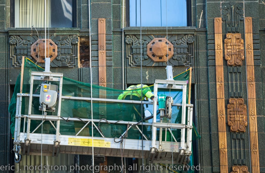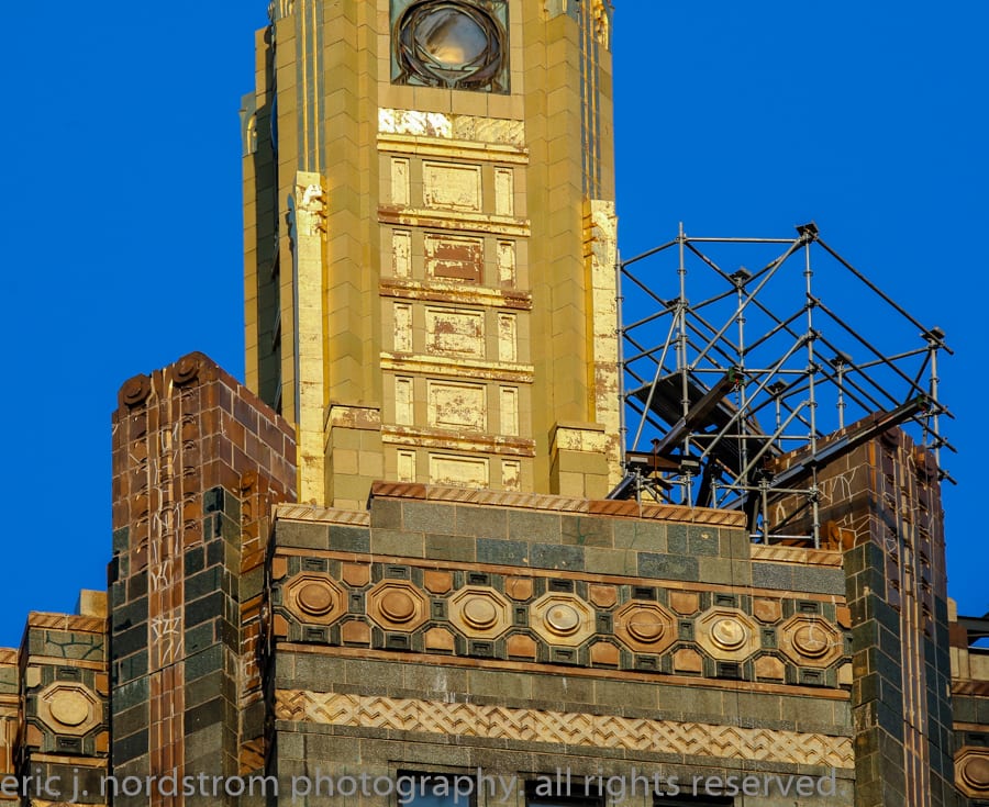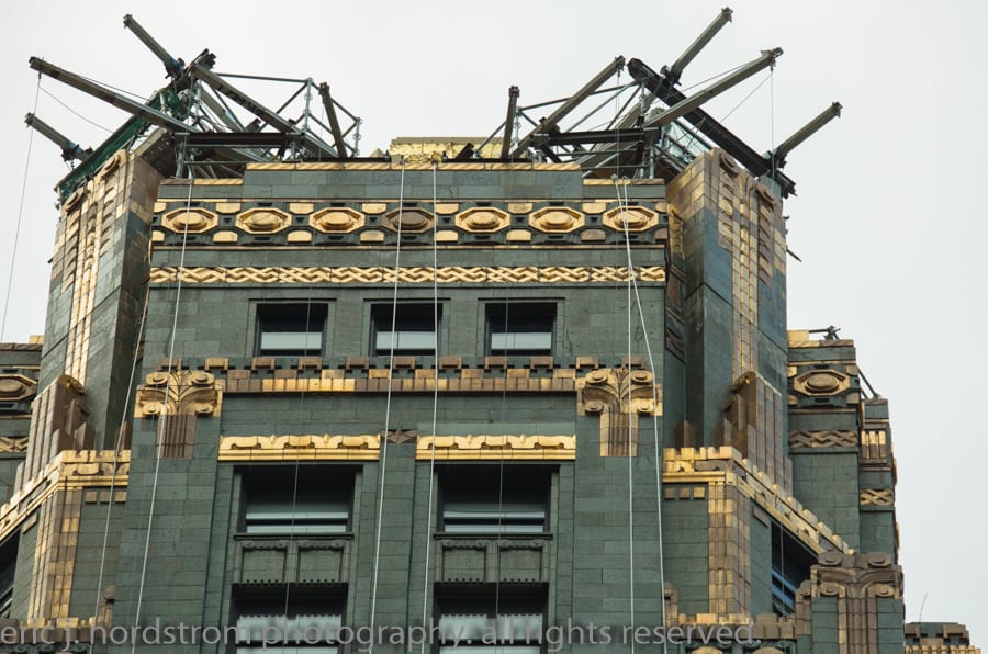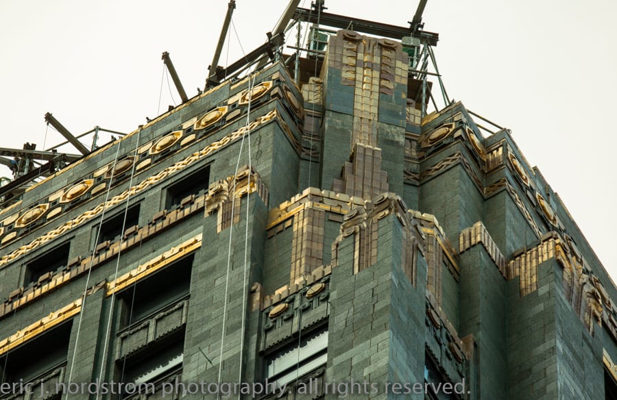 the 37-story carbon and carbide building (1929) appears to be undergoing facade restoration. i did notice cavities covered over with plywood – mainly along the east facade. i was a bit rushed, so will have to revisit and document facade more thoroughly.