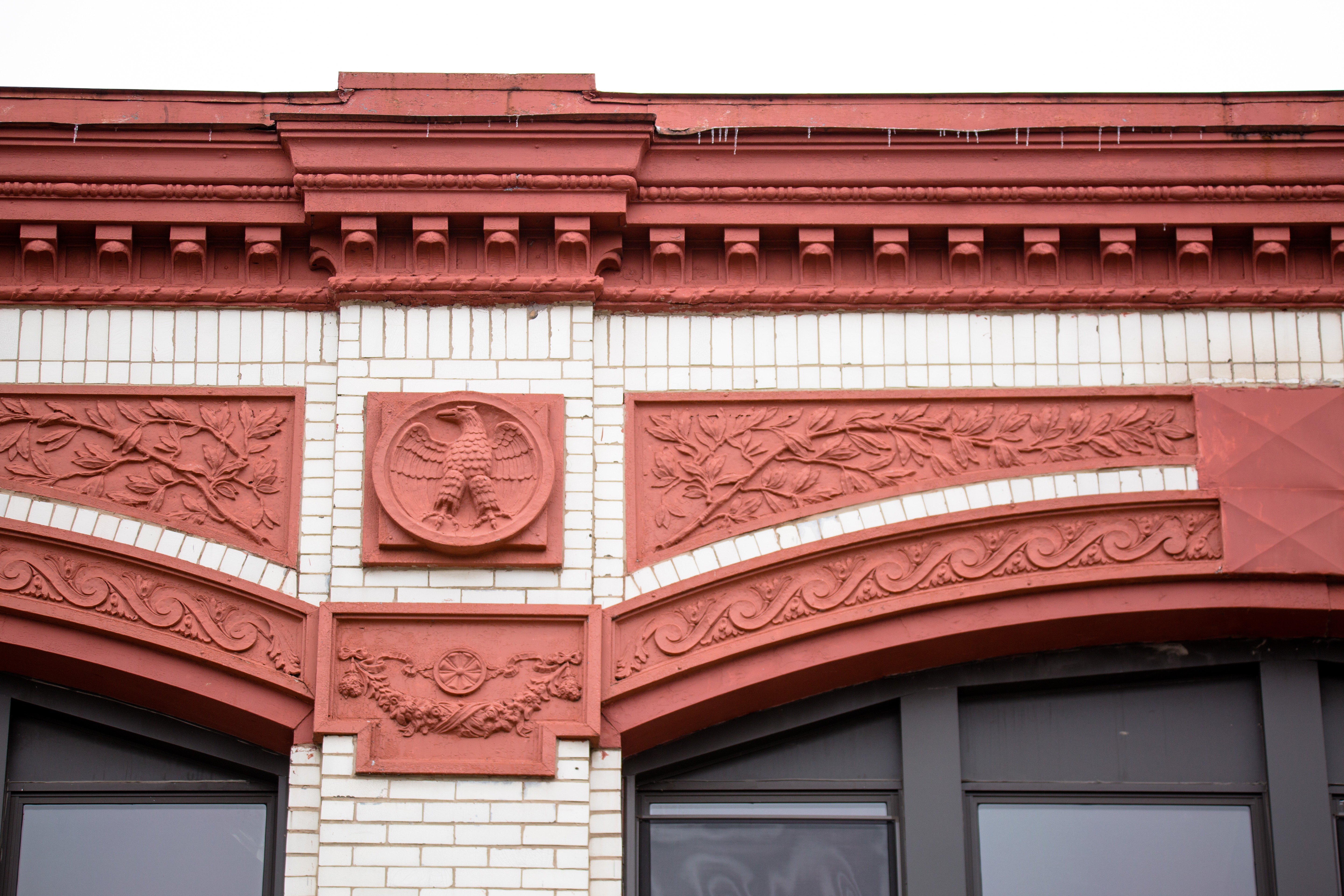 at first i thought the ornament, including the eagles were comprised of terra cotta or possibly limestone. after closer inspection, any and all of the red-painted ornament is comprised of galvanized tin against glazed white face brick.