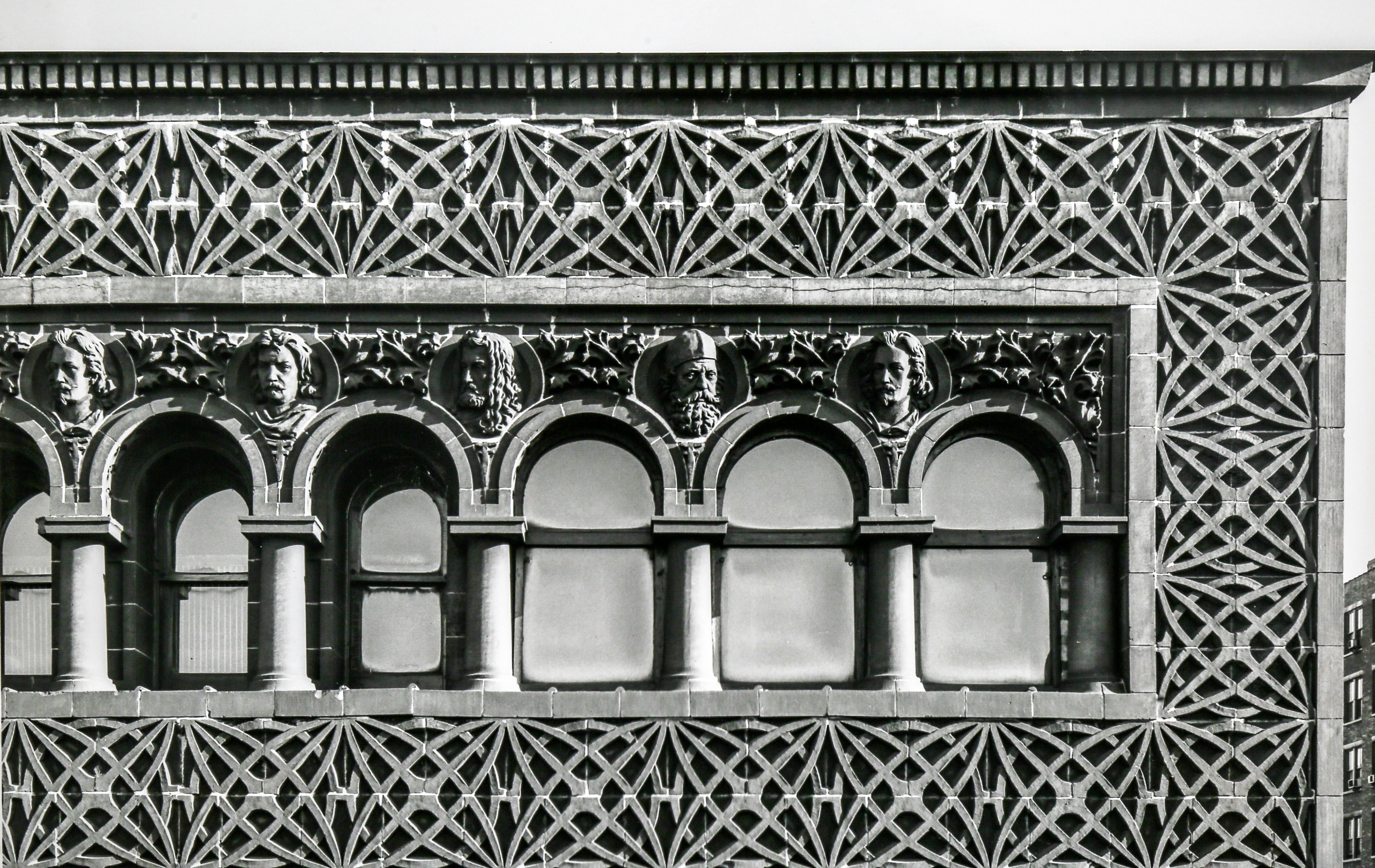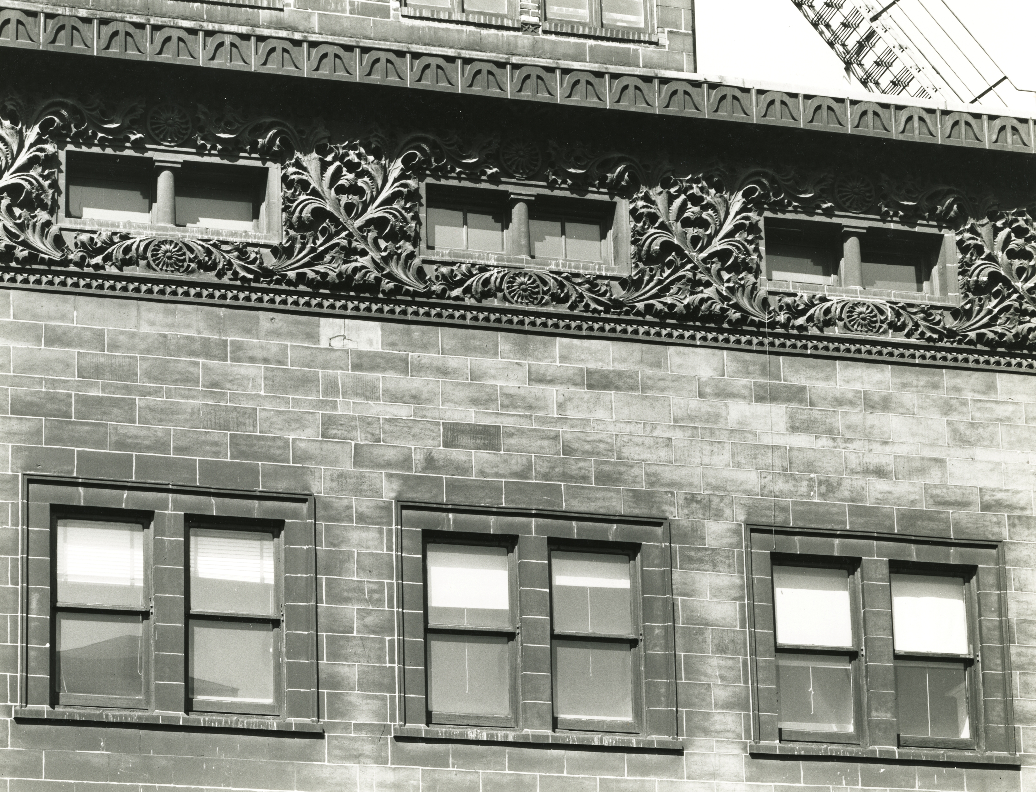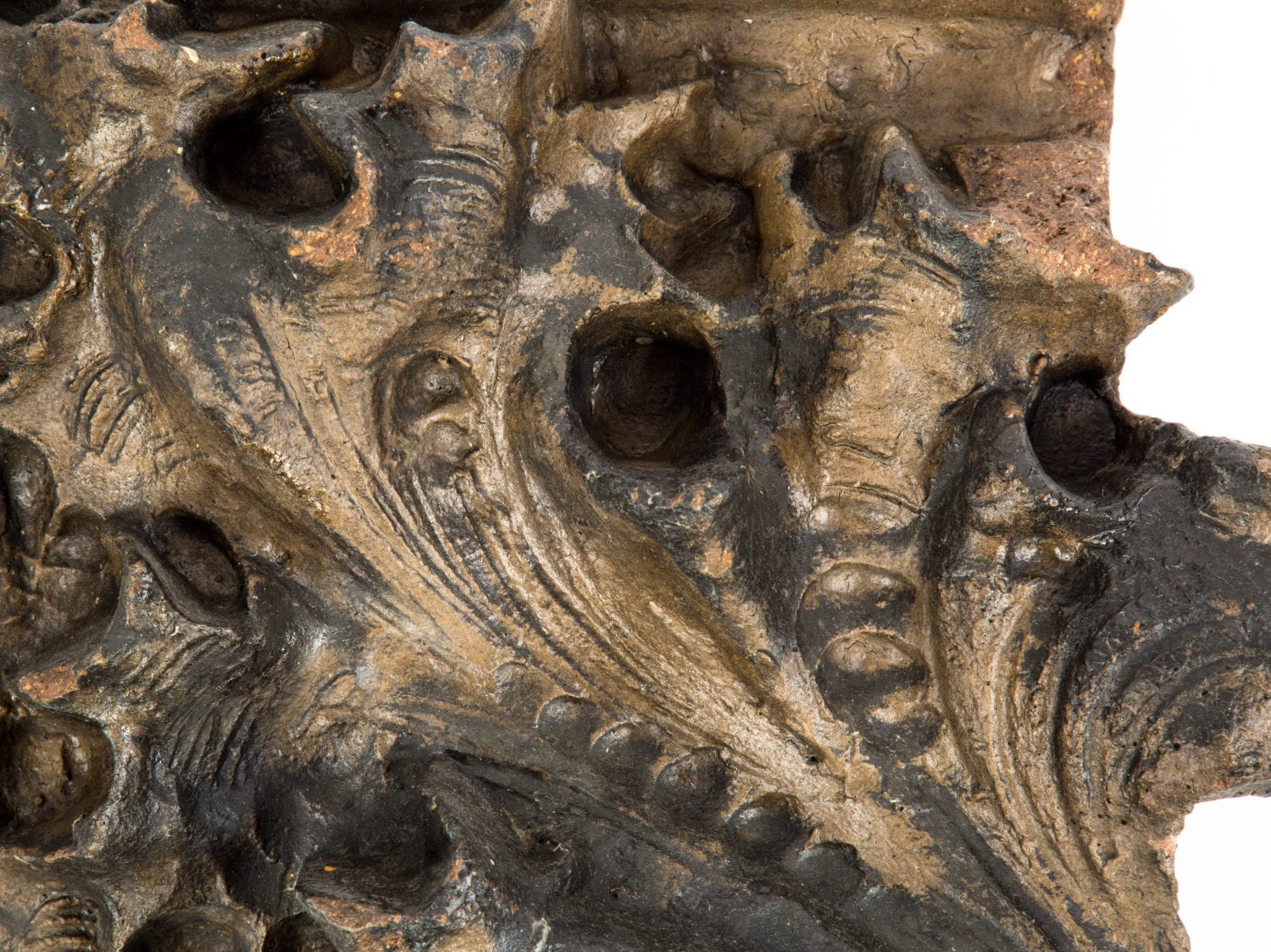 detail of garrick theater or schiller building terra cotta fragment salvaged by richard nickel, john vinci, or david norris. the intricate leafage was designed by louis sullivan and executed by kristian schneider for the northwestern terra cotta company. the glazed terra cotta fragment looks as it did when it was a part of the building (demolished in 1960). the buff-colored terra cotta had turned black over the years from prolonged exposure to air pollution (the same conditions were evident on the chicago stock exchange”s terra cotta facade). the darkened and/or soiled terra cotta was a contributing factor in the demolition of both the garrick and stock exchange.