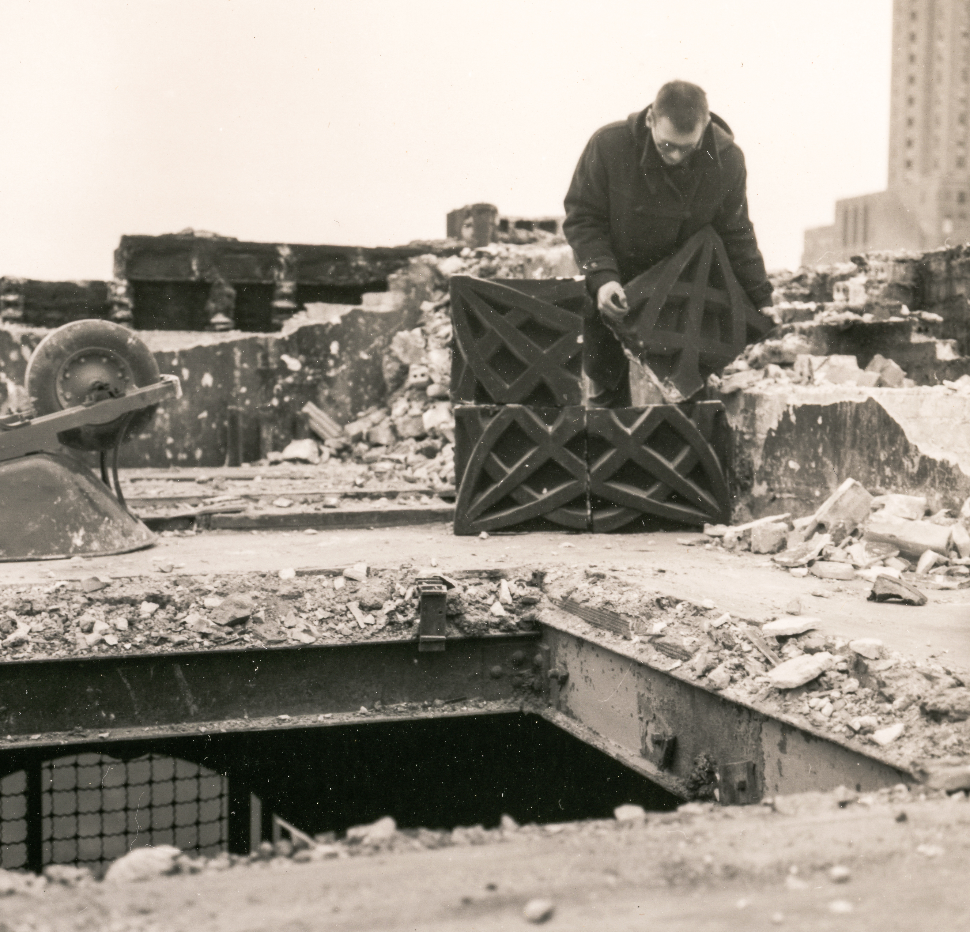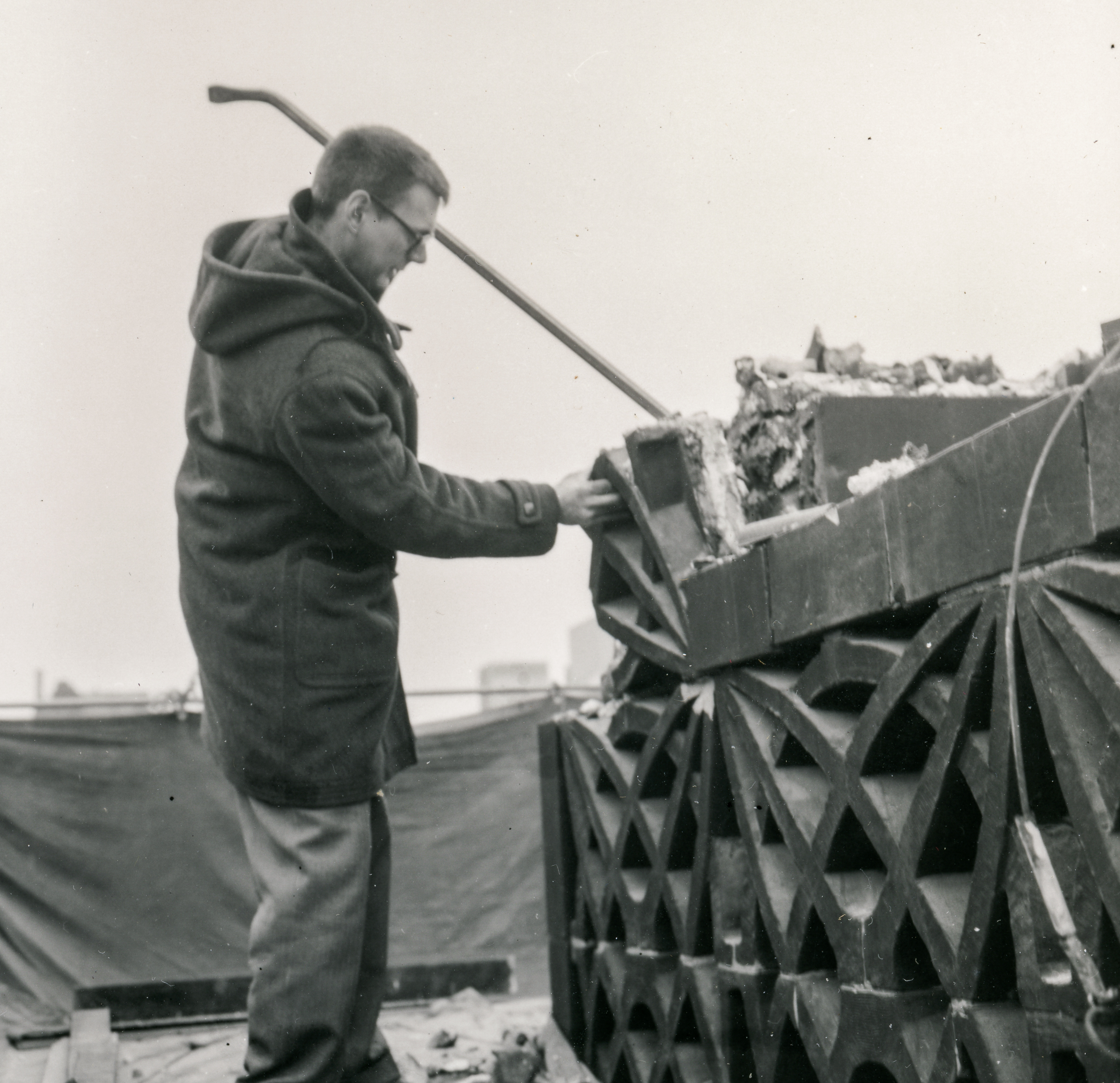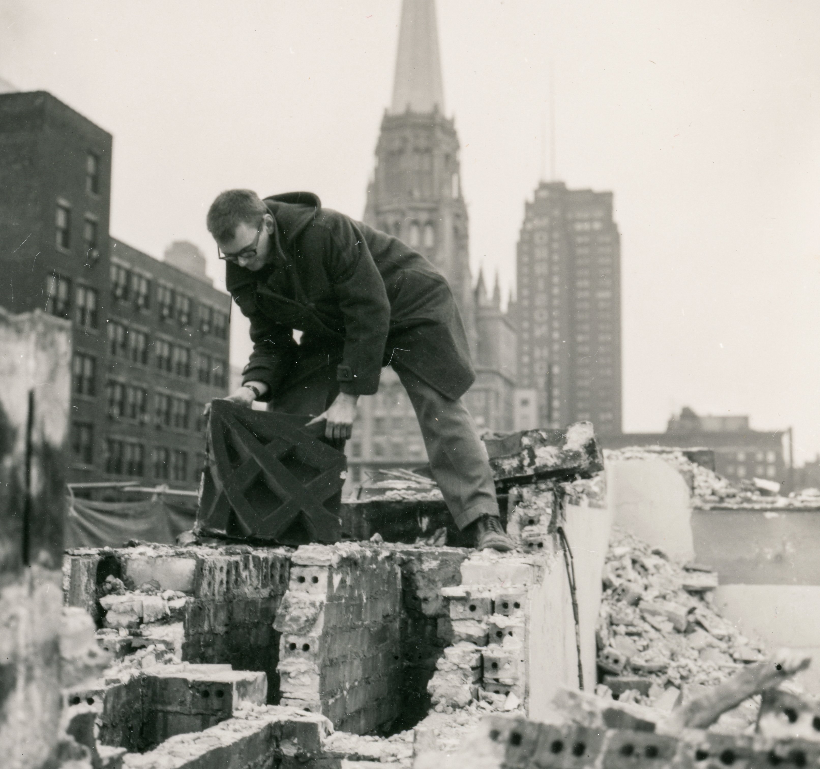 richard nickel salvaging terra cotta ornament from garrick theater (1891). the enlarged and edited images were pulled from a contact print photo. date to 1960. john vinci, photographer. the photos offer a rare glimpse of nickel salvaging ornament, including the tools he used, his approach to extracting ornament, and other factors that lend invaluable insight into the methods he developed to extract ornament from buildings demolished nearly 60 years ago.