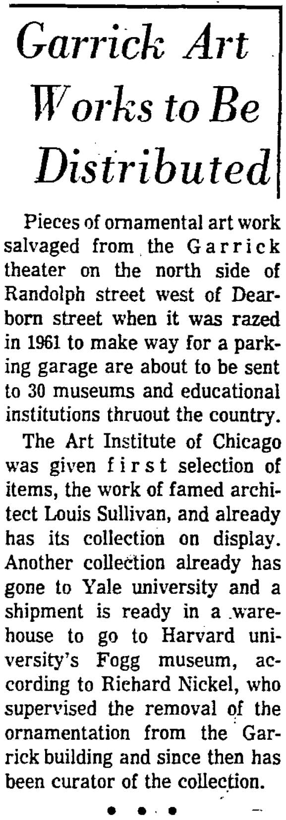 in 1950, the theater was closed and converted into a television studio. seven years later, it was sold to balaban and katz, who reopened the building as a movie theater. eventually balaban and katz no longer considered the architectural gem commercially viable, and made a deal to wreck the building and redevelop it – tragically – as a parking structure. the garrick was razed in early 1961, but the demolition served as a clinching point in the preservation movement in chicago, instigating a major outcry from the public and becoming an important salvage for richard nickel and his associates. corroborated by historian tim samuelson, the only people allowed on the wrecking site were the authorized team of richard nickel, john vinci, david norris, and charlie gregerson. the entire team had been hired under the sponsorship of the world book encyclopedia and the municipal reference library of chicago to salvage materials specifically for distribution to interested museums and public institutions.