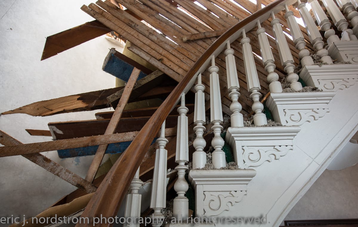 i have never worked with this wrecker so i’m on the sidelines documenting the carnage. based on the now-destroyed solid walnut staircase with multi-faceted newel post and corbels found in the rubble, it clear no one secured salvaged rights. shame.