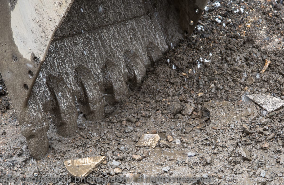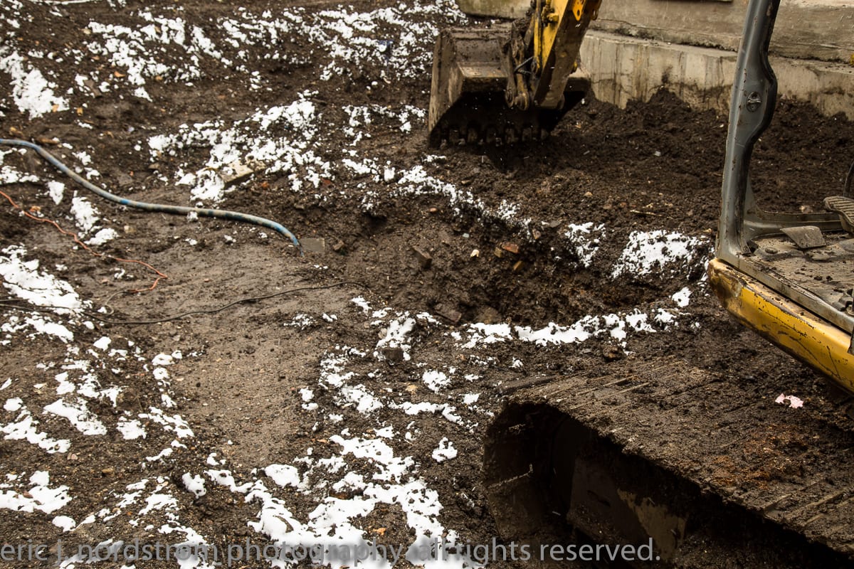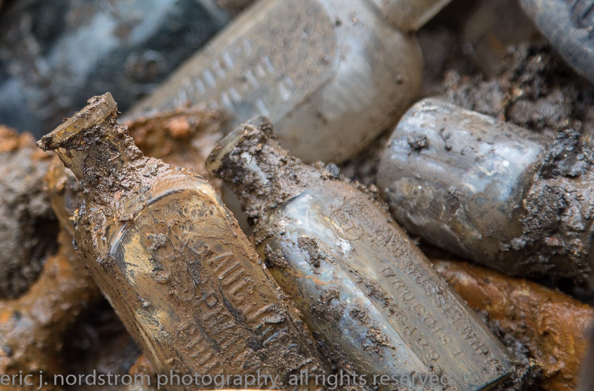 when i arrived, i could distinctly recall the 1880’s house (without a basement) that once stood there – it was demolished late last year and a subsequent excavation was put off. i spent the afternoon there documenting artifacts as they were pulled from the ground, and the refuse recovered from the bottom-most layer suggests usage of the dump beginning in the mid-1880’s.