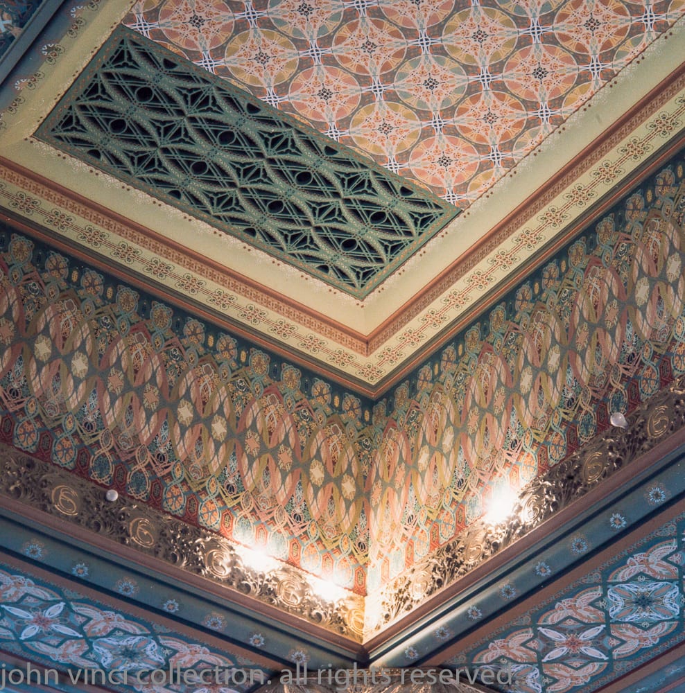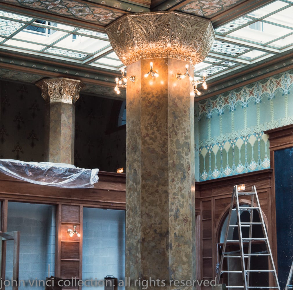 the architectural firm of adler and sullivan designed the chicago stock exchange built between 1893 to 1894. when the building was undergoing demolition in 1972, richard nickel, john vinci, david norris, tim samuelson and others were instrumental in salvaging sullivan’s elaborate polychromatic stencils (executed by design firm healy & millet) cast plaster capitals, and strongly geometric art glass for use when architects john vinci and larry kenney reconstructed the trading room in the art institute’s rubloff building between 1976 and 1977.