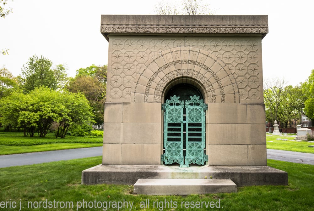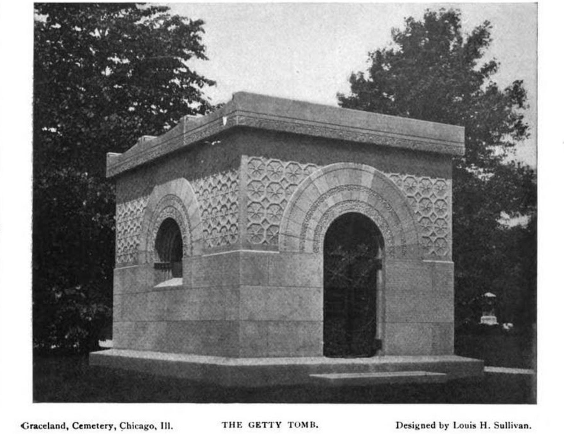 the carrie eliza getty tomb was commissioned in 1890 by lumber baron henry harrison getty for his wife carrie eliza. it was designed by louis h. sullivan of adler & sullivan. getty chose Sullivan based on his appreciation of adler & sulllvian’s buildings located in downtown Chicago as well as the mausoleum sullivan designed for getty’s late partner, martin ryerson (completed in 1887).