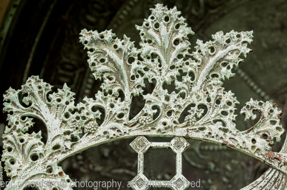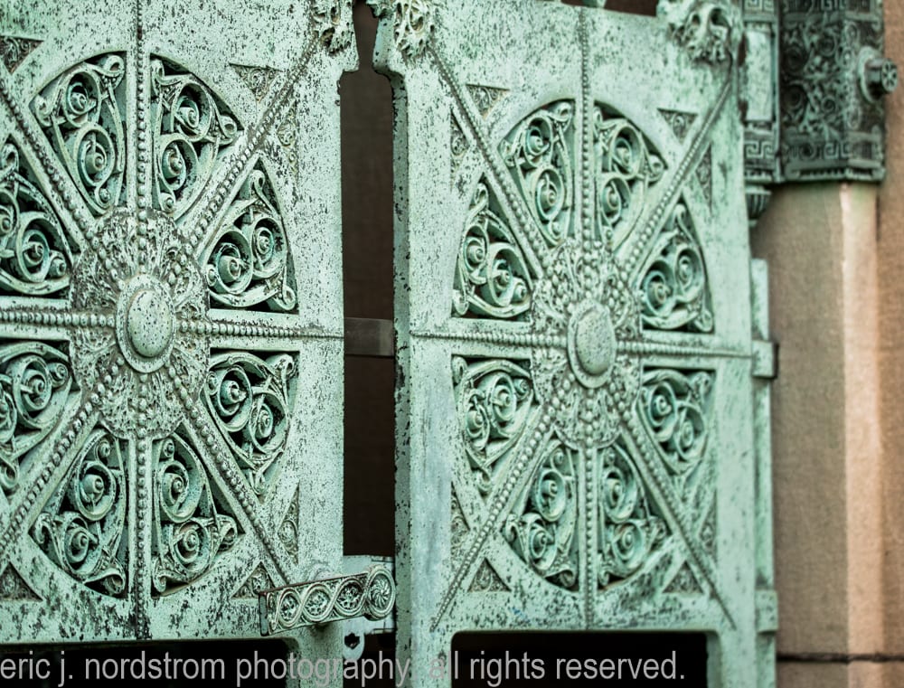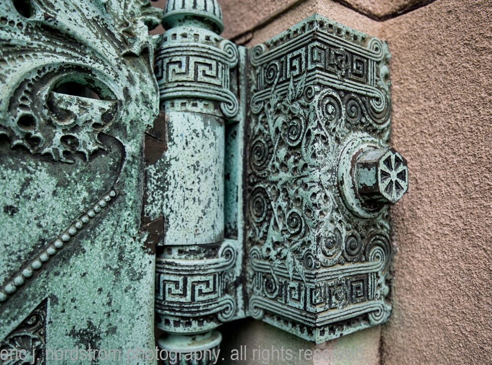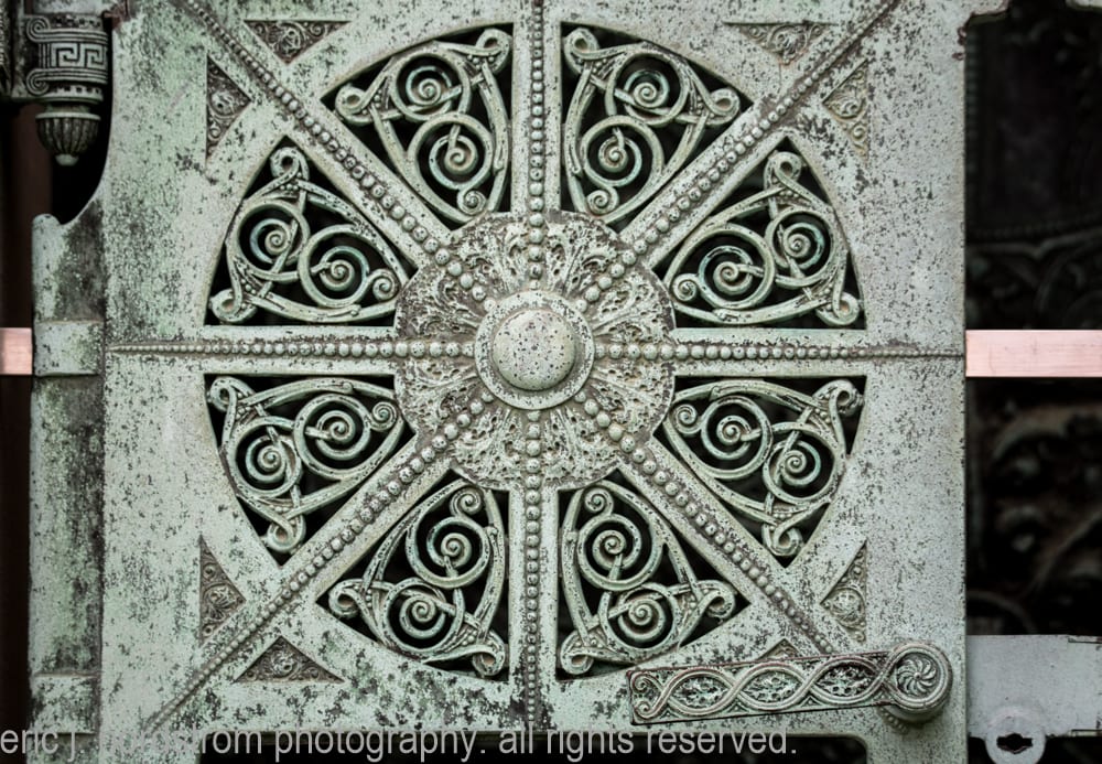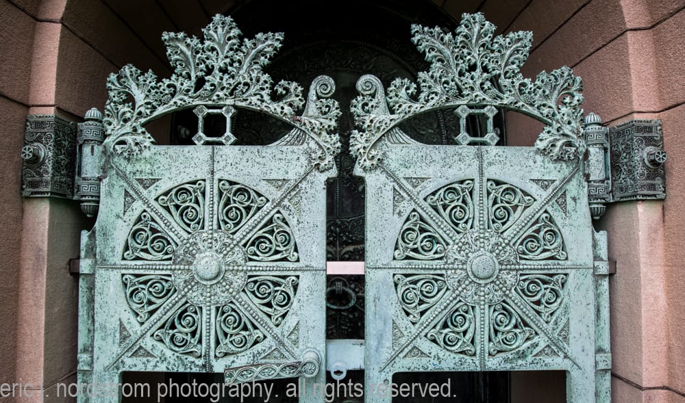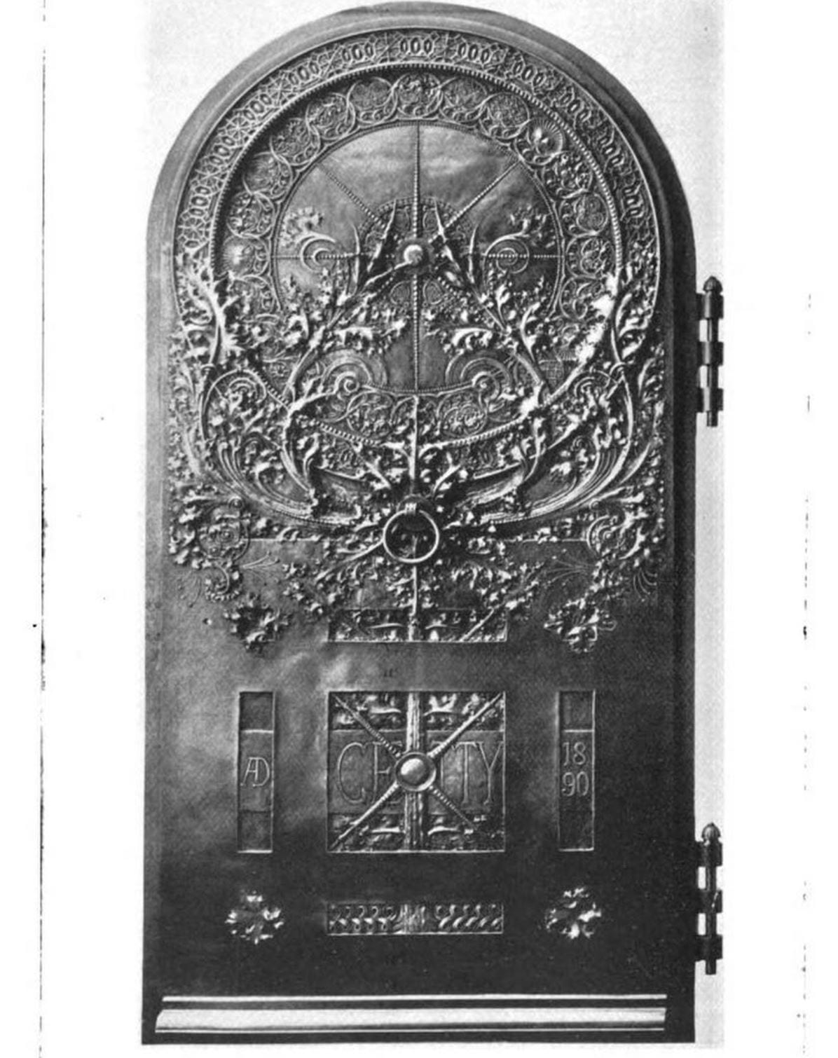 located below the semi-circular segmented archway bearing the name of the deceased is the ornamental cast bronze hinged gates and single door with oversized drop handle. The bronze work was executed by the yale & towne mfg. company of Stamford, ct. sullivan later had a plaster cast of the door made where it received an award at the at the 1900 paris exhibition.