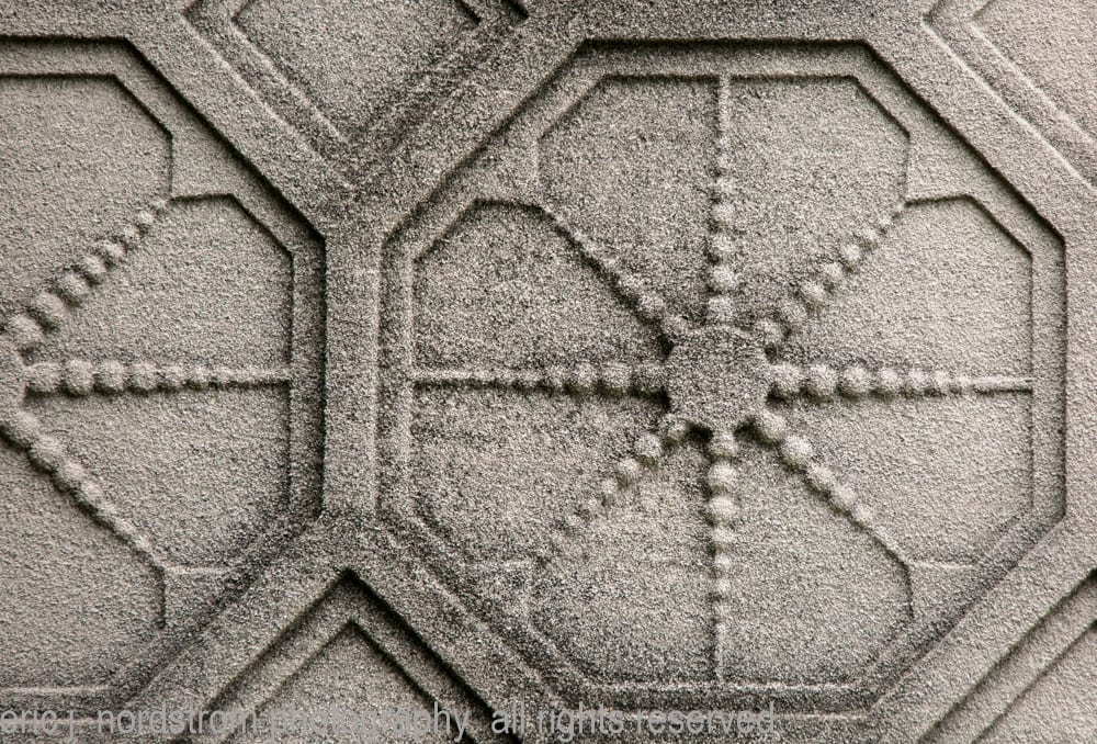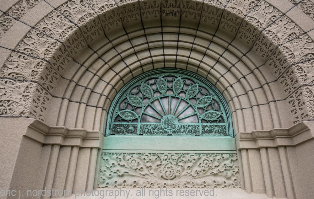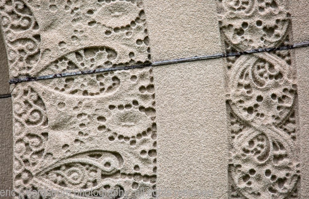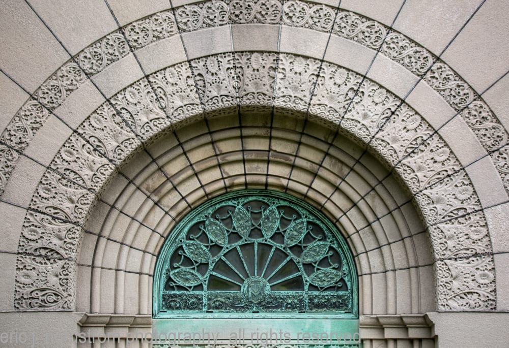sullivan devoted a great deal of energy to the masonry joinery, making it a critical facet of the structure’s overall composition. the ashlar limestone slabs were arranged horizontally to form the lower walls. the arches and windows or portals are surrounded by a field pattern consisting of repeating octagons accentuated with starbursts. the roof consists of three massive stone slabs curving upward along the edges.