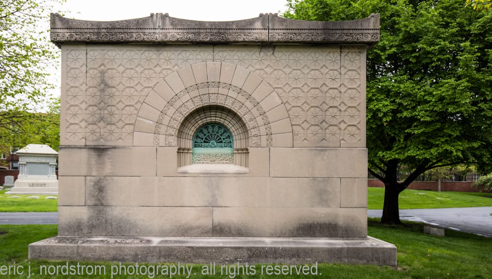 the rectangular-shaped tomb was built using Indiana or bedford limestone blocks with masonry joints sealed with lead. the upper half of the structure contains a distinctive field pattern comprised of strongly geometric repeating carved octagons accentuated with eight-pointed “starbursts.” the projecting cornice features a single band of intricately designed spiraling floral motifs. the roofline is flat on the front and back and scal