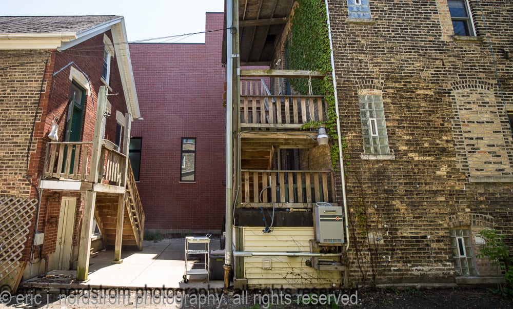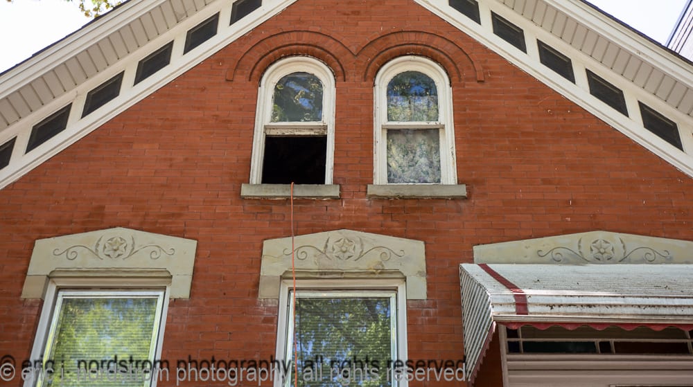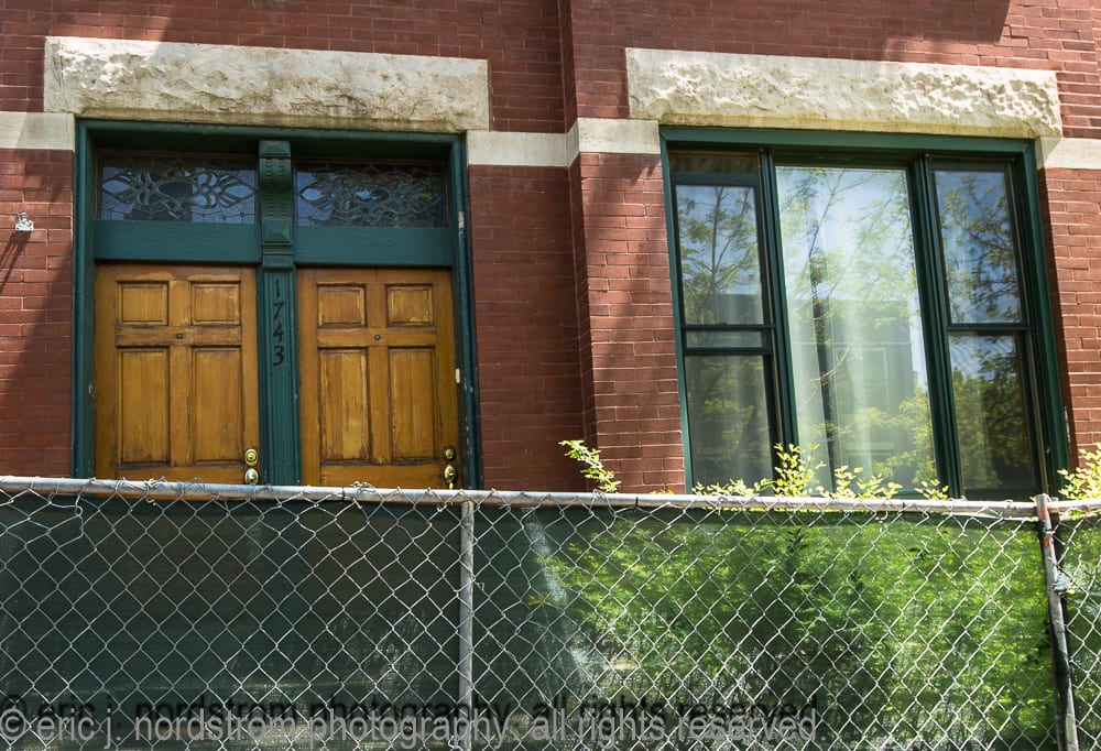 a red brick two-flat with jeweled and beveled transom windows above the main entrance shares a lot where one of the cottages is located. with the green fence erected around premises, and utilities severed, the structures will likely be in the landfill by the end of next week.