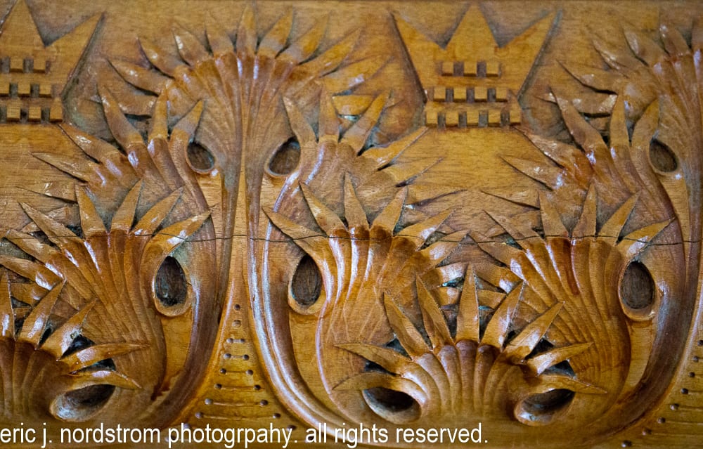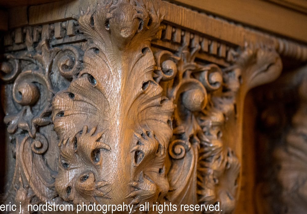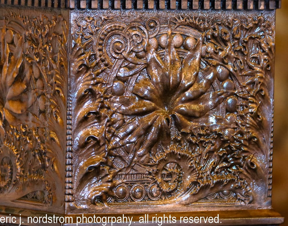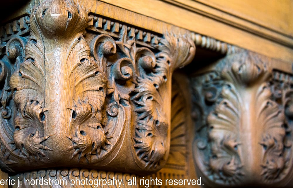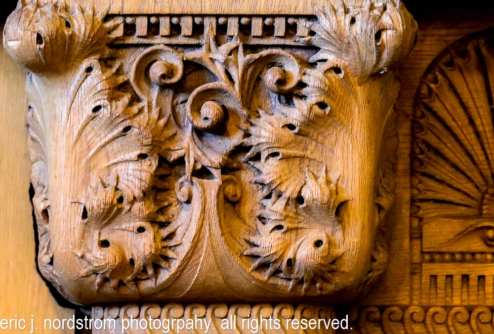 hand carved quartered oak wood lobby detail – adler & sullivan’s auditorium building (1889). the ornamental woodwork for reception, hotel lobby, and reading rooms was executed by carsley & east mfg. co.