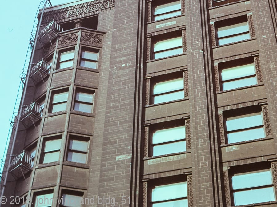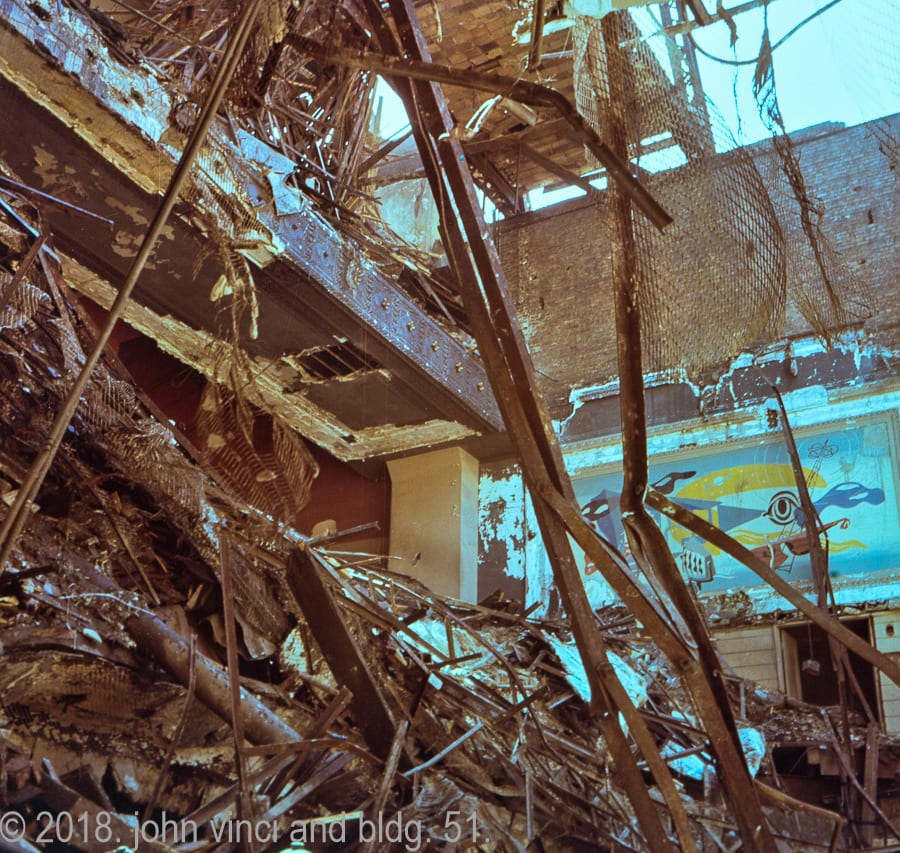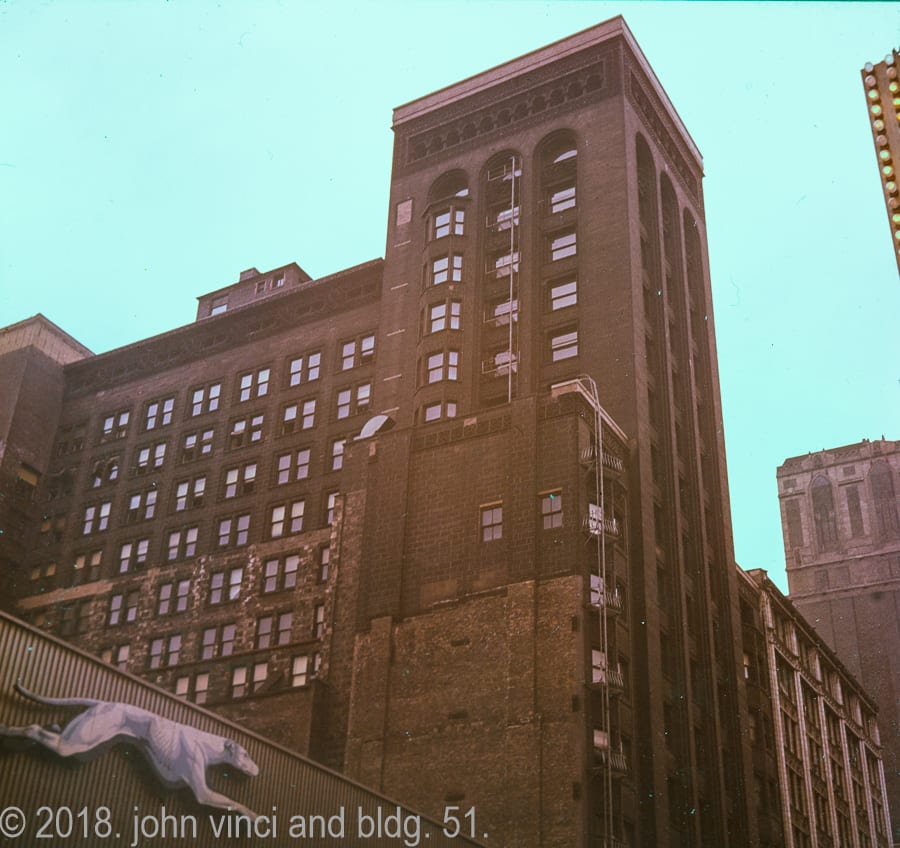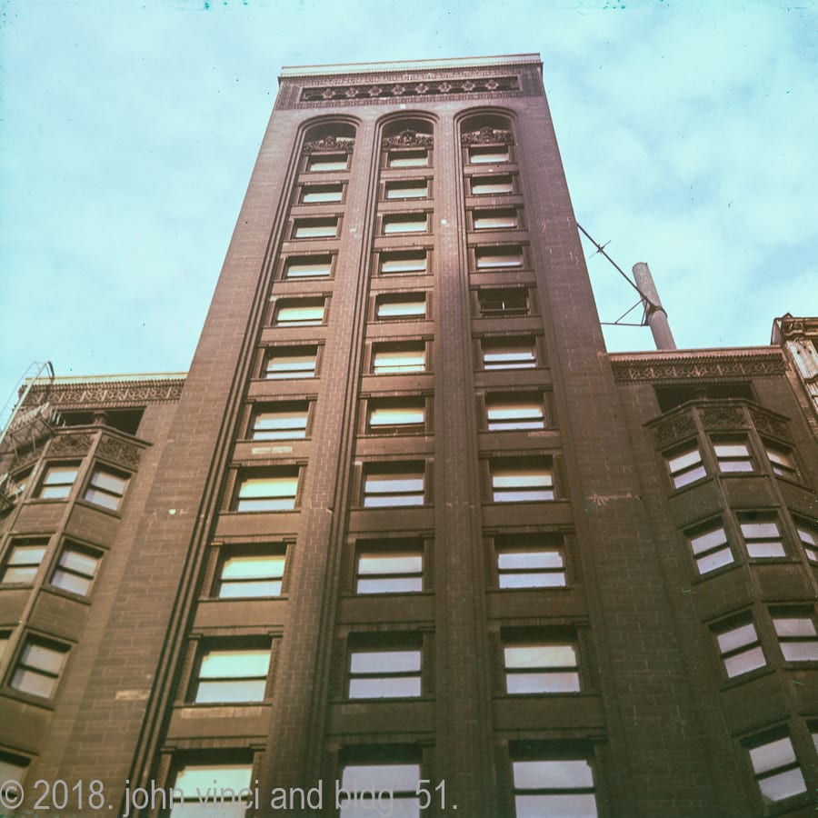 the following john vinci slides paint the demolition of adler & sullivan’s schiller building or garrick theater (completed in 1892) in full color, thanks to the use of kodachrome, which was the first commercially successful color film praised since the great depression for its sharpness, archival durability, and vibrant yet realistic hues.