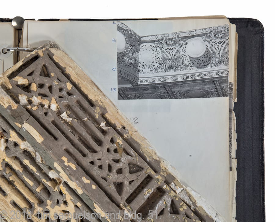 the loose leaf booklet – ravaged from being lugged around both the demolition site and navy pier – contains a combination of nickel’s heavily cropped silver gelatin prints of ornament pasted on the page as a “system,” consisting of multiple components that were individually identified for removal and reassembly for further docukentation and/or exhibits. a few pages contain a partial inventory of the ornament salvaged and stored at navy pier, before being quickly disseminated to numerous institutions requesting examples of sullivan’s ornament for their collections.