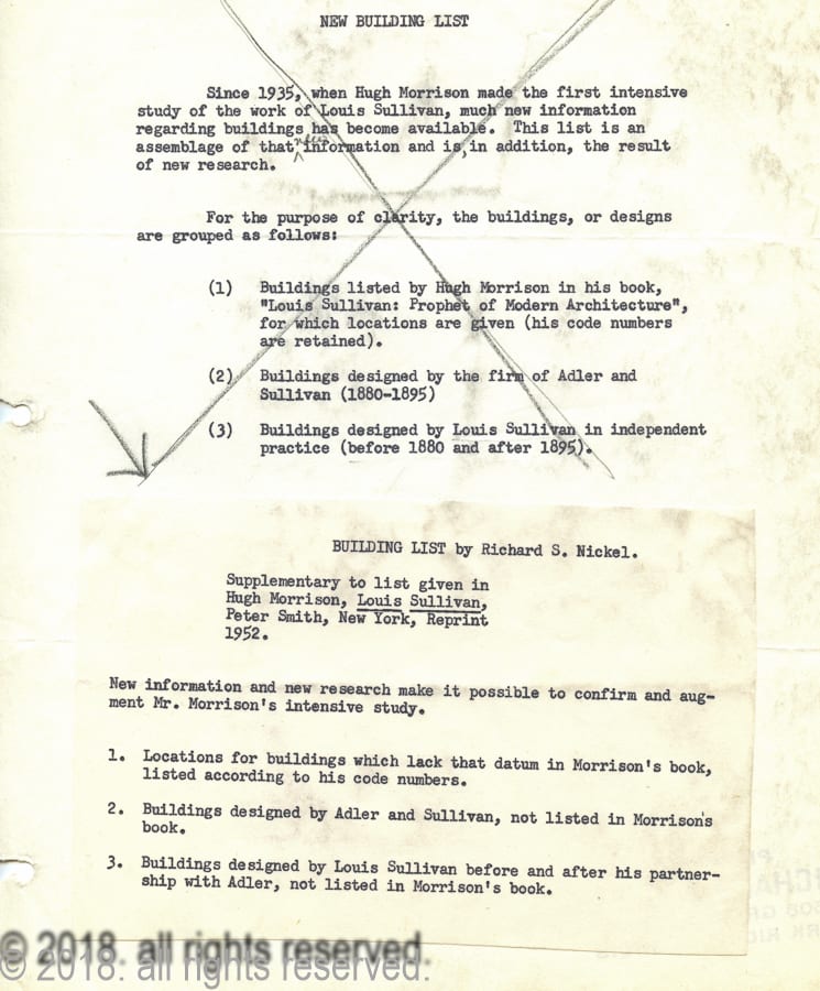 the genesis of a comprehensive catalog of adler & sullivan’s work – consisting of a complete listing of any and all known buildings and projects undertaken by adler and sullivan spawned from the photographic survey conducted by siskind and his students in 1950’s. the adler and sullivan book was finally completed in 2010, thanks to the persistence of john vinci – a colleague and friend of both nickel and siskind. sadly, both died (nickel early on in 1972) before the book was finally completed.