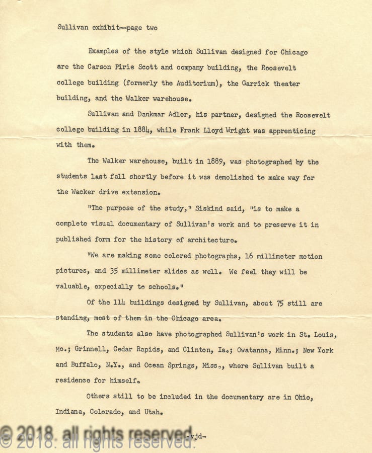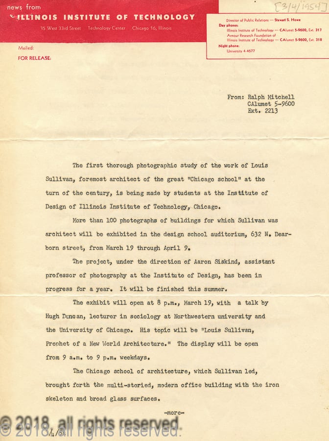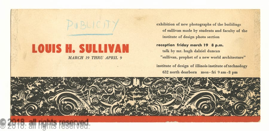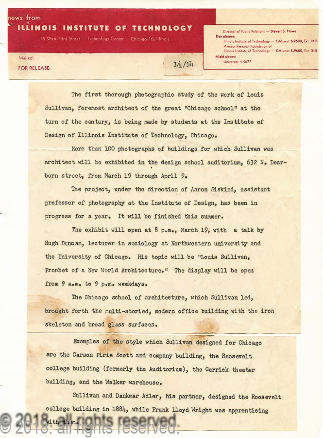 the sullivan photography project resulted in the documentation of many works by adler and sullivan that had been previously overlooked. in 1954, siskind compiled 126 works from the project, illustrating thirty-five sullivan buildings for the exhibition louis h. sullivan, held at the institute of design – then located in the former chicago historical society building designed by henry ives cobb in 1892.