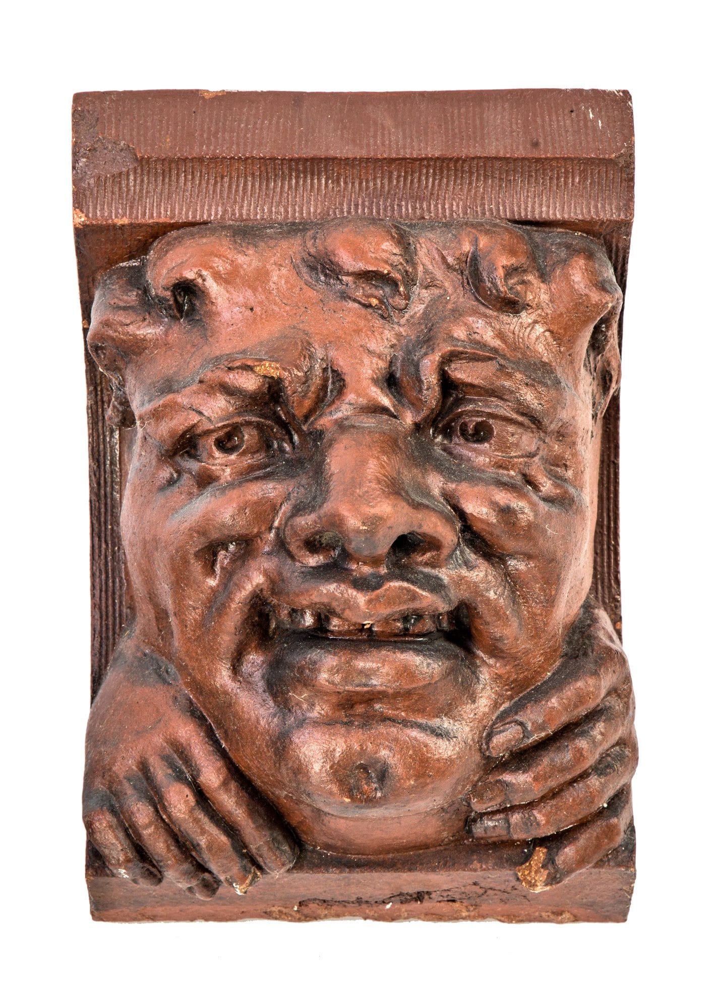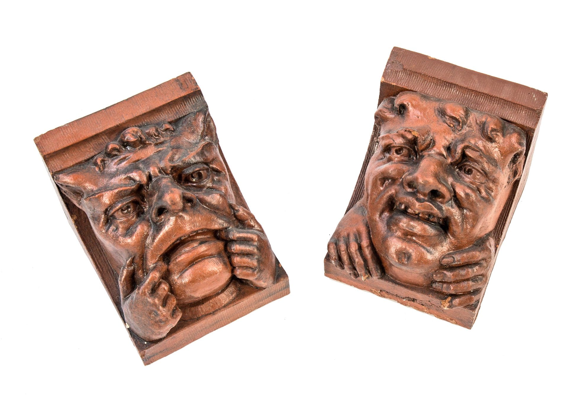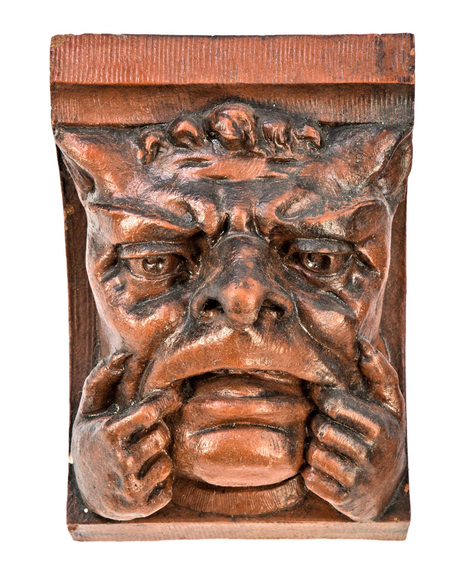 two original red slip glazed terra cotta grotesque face exterior corbels salvaged from charles sumner frost’s chicago and north western railway train station (1889-1890).
