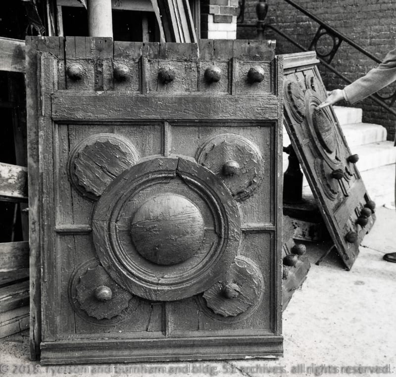 during its demolition in 1963, nickel saved the black painted ornamental pine wood spandrels, strongly geometric art glass windows, limestone panels, cast iron newel posts, and the slender wood mullions. a two-part limestone panel is on display at edwardsville.