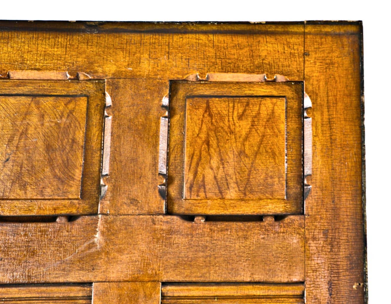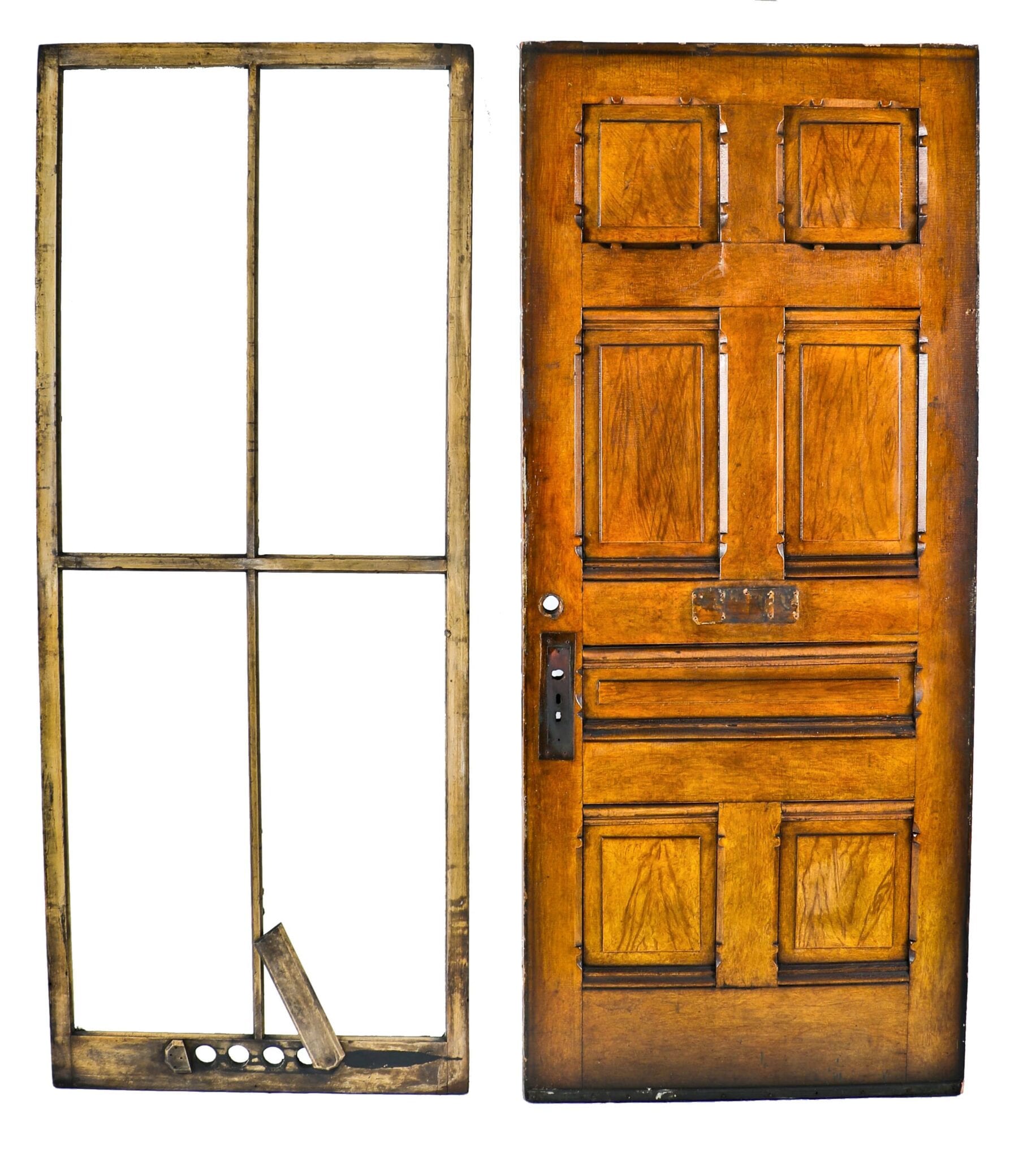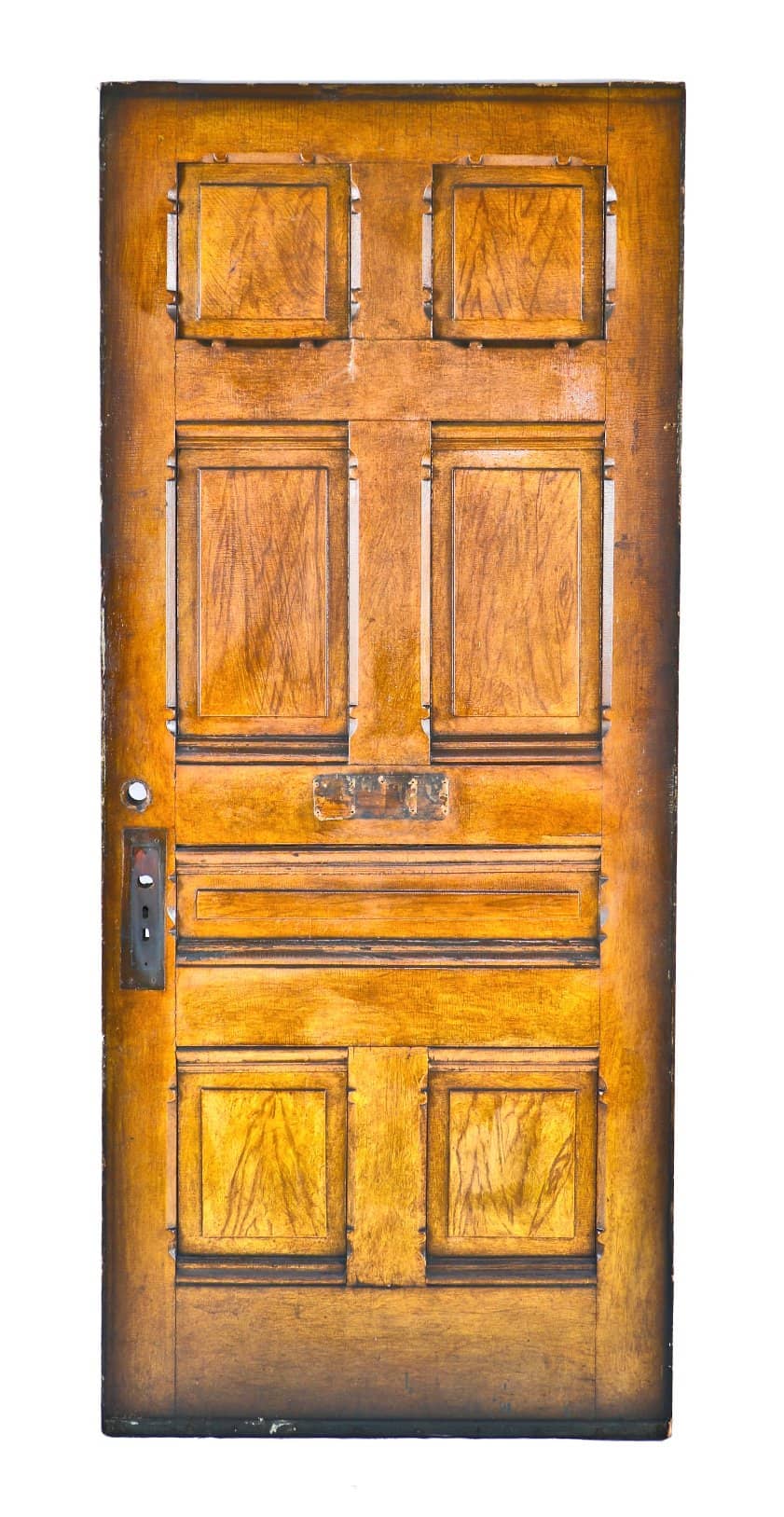 the most unexpected surprise was the original, heavily chamfered residential pine wood entrance door with a wonderfully intact faux wood grain finish hidden behind a wall. it seems it was covered over when the home received an addition, which subsequently moved the entrance door further south.