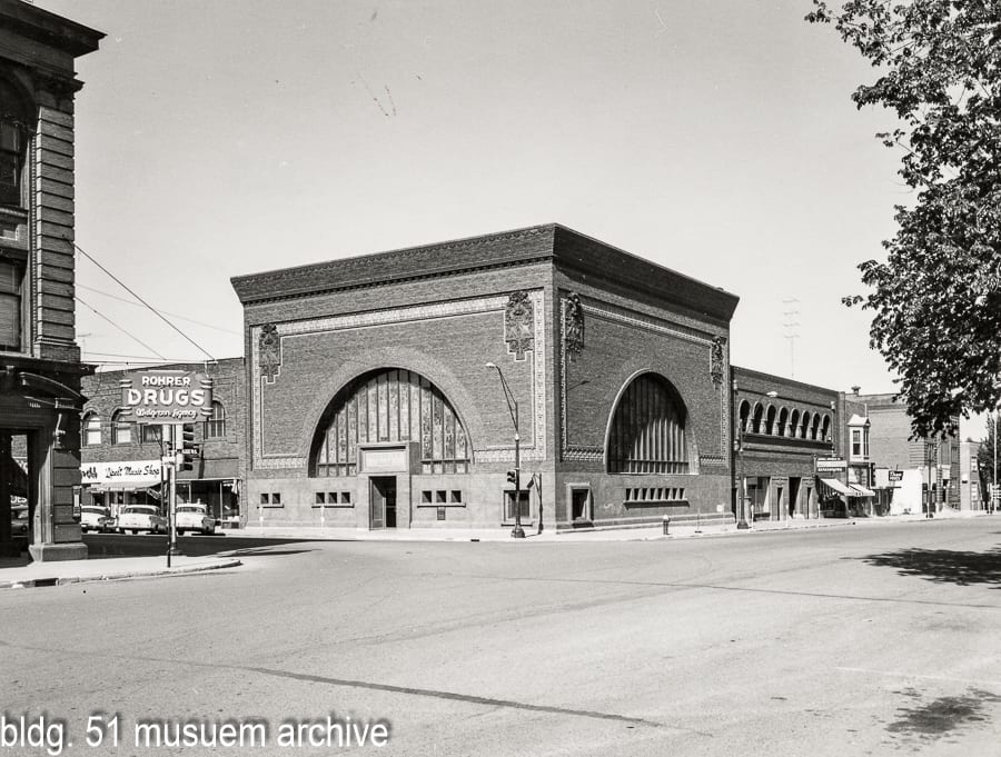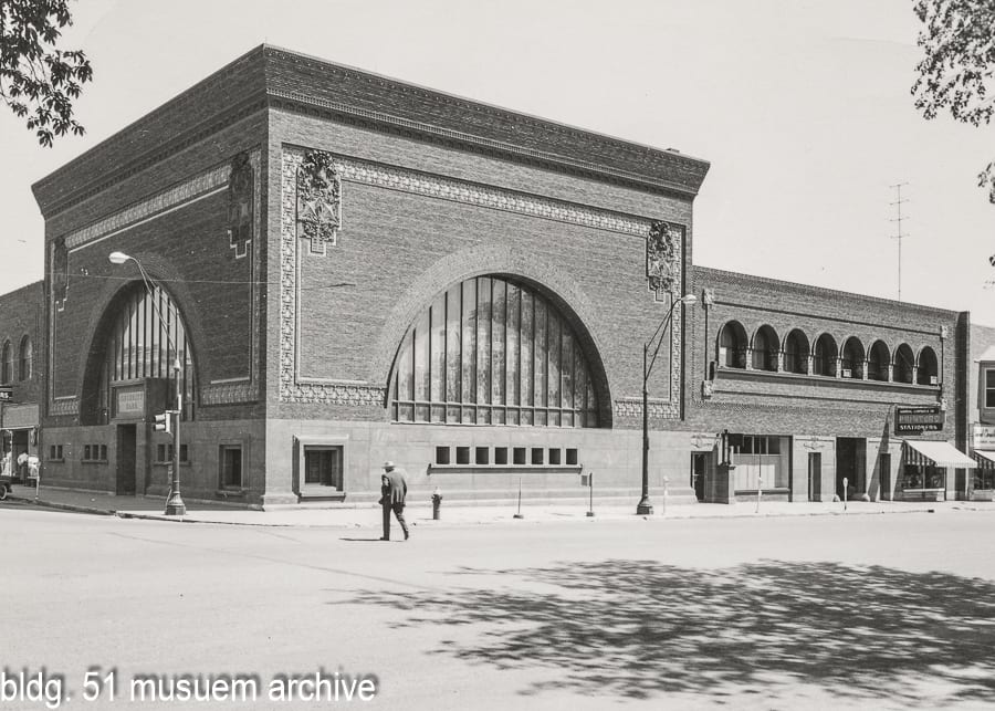 below are photographic images taken by richard nickel in the late 1950’s when he was still a student at the institute of design, early photo-postcards, and an original 1958 bank pamphlet of the bank’s exterior and interior around the time it was heavily remodeled.