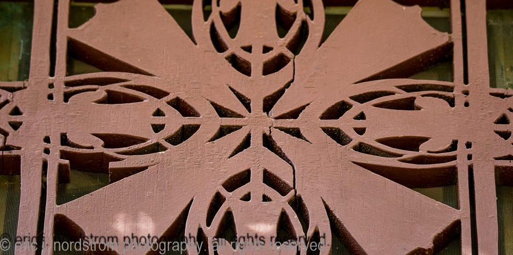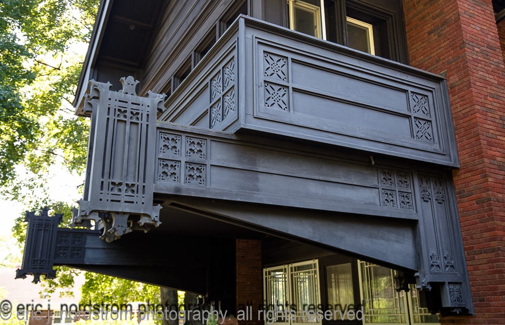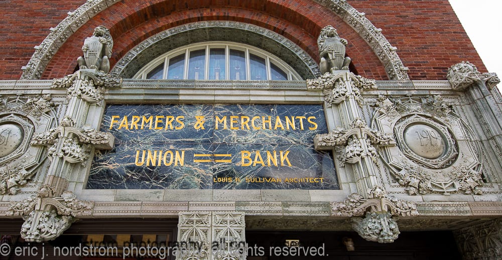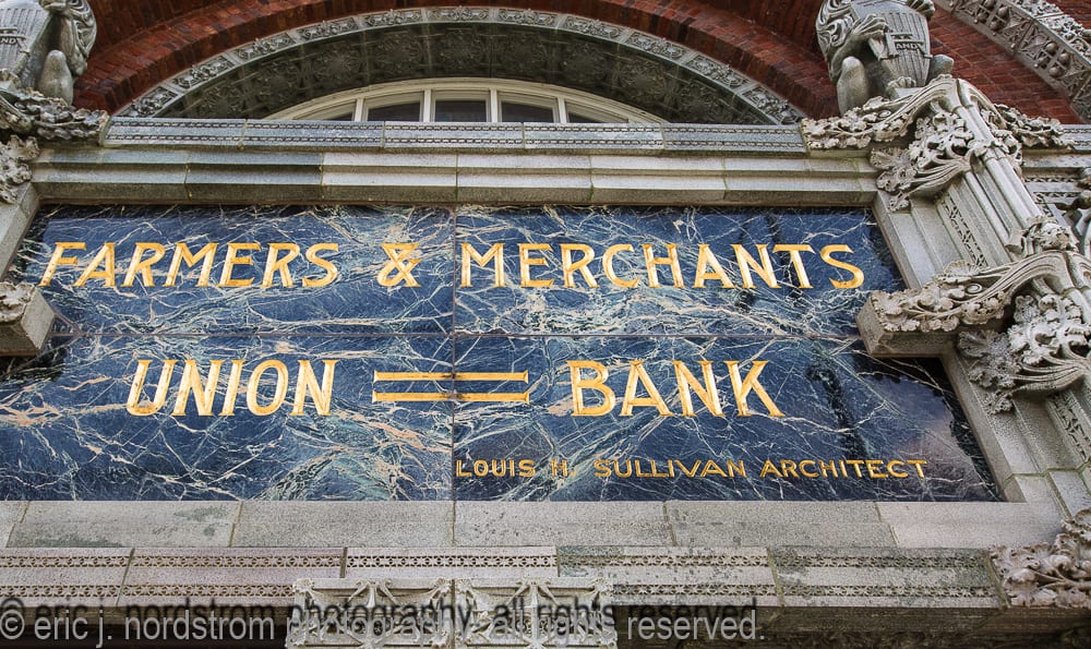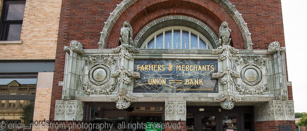 unfortunately, i haven’t had much time to visit neighboring wisconsin this year to photograph architecture in cities and town across the state. i did have a chance to revisit louis h. sullivan’s farmers and merchants union bank in columbus (1919) while in madison shooting the two bradley houses – the first by sullivan (1908) and the second by purcell, feick, and elmslie (1910). sadly, i did not get to see the interior of purcell and elmslie’s josephine crane bradley house, but i did manage to document exterior ornament, including the art glass front door, fret-sawn wood panel, etc.