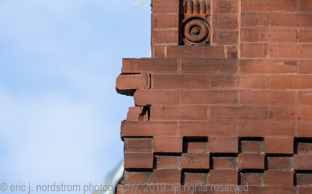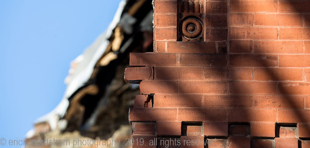 one of the two italianate style houses has been mostly reduced to rubble. the one to the east is still standing, but the cornice is mangled and minton tiles ready to fall from the facade at any moment.