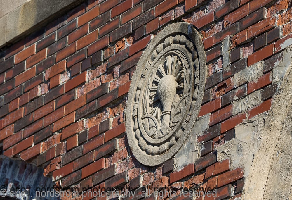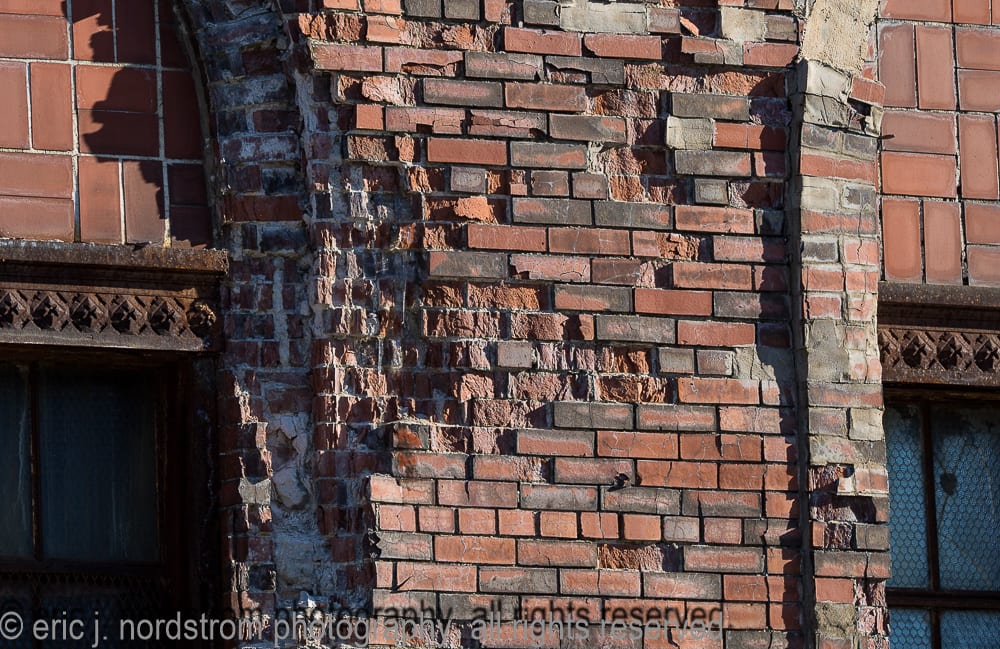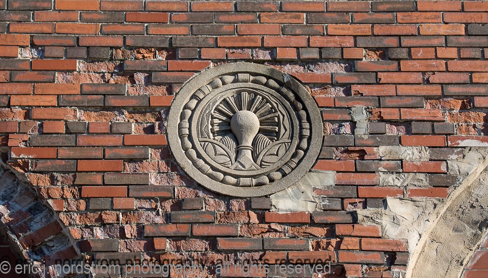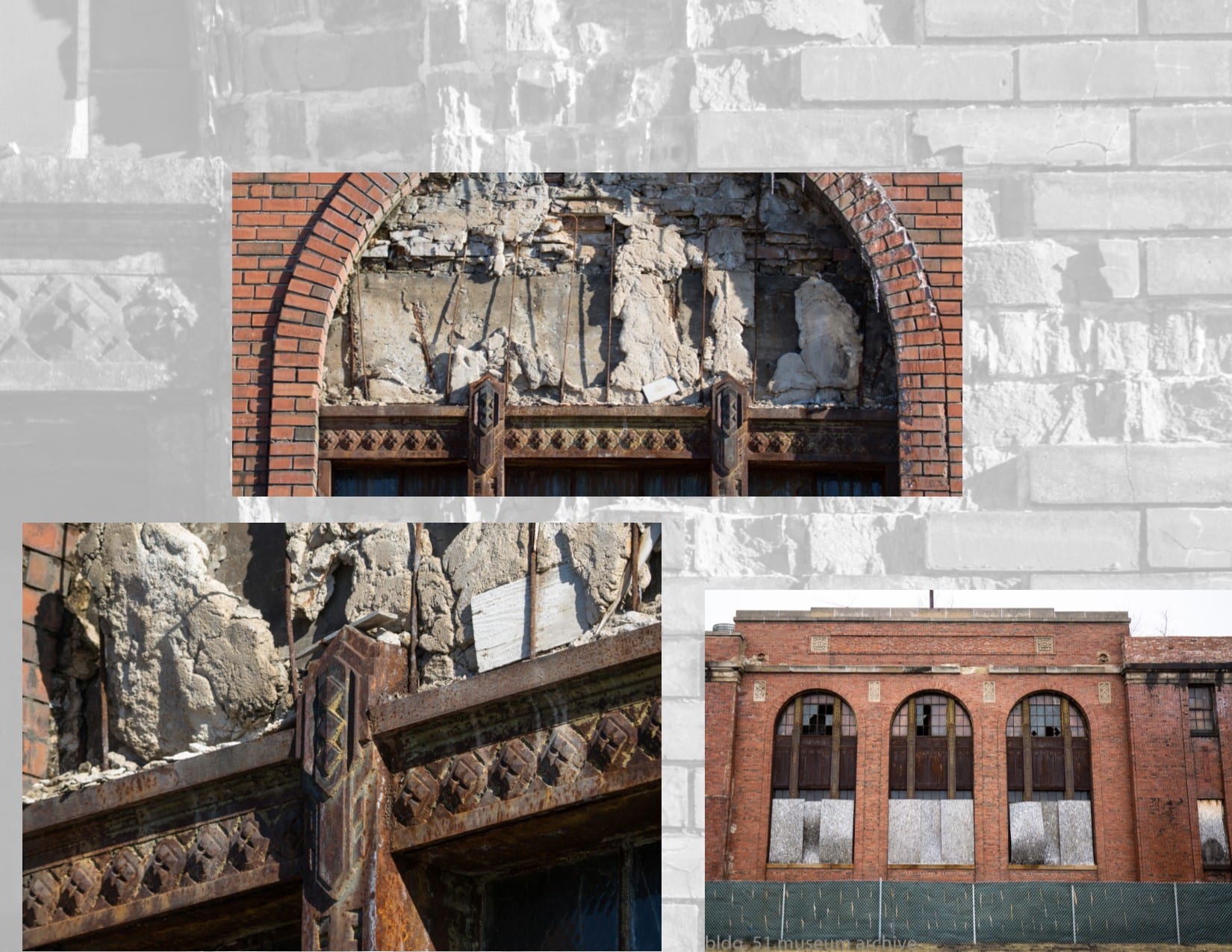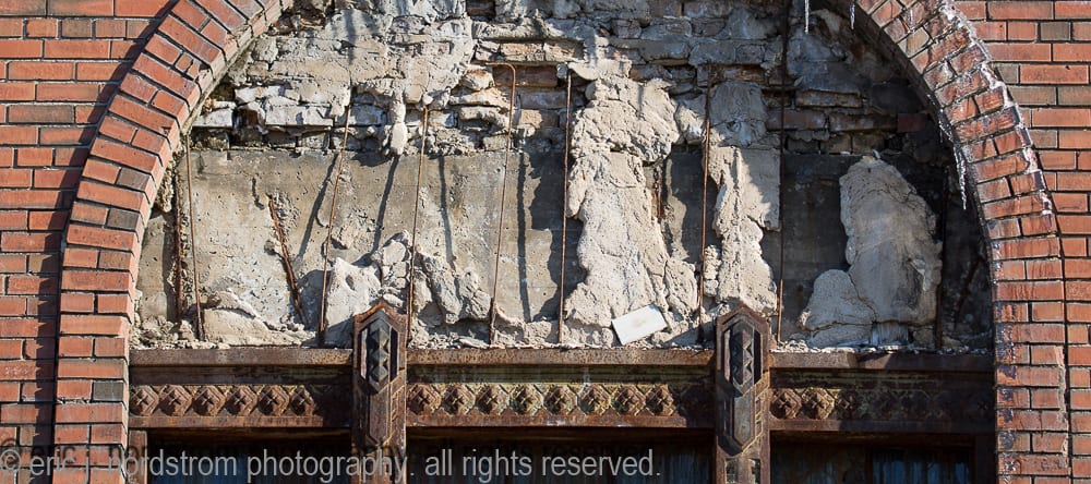 moisture penetration deeply embedded in exterior walls has caused the facade to buckle in some places. spalling of face brick continues – in various degrees of severity – to spread from one end of the facade to the other. one of holst’s signature patterned tile lunettes lays in ruin on the sidewalk enclosed by fence.