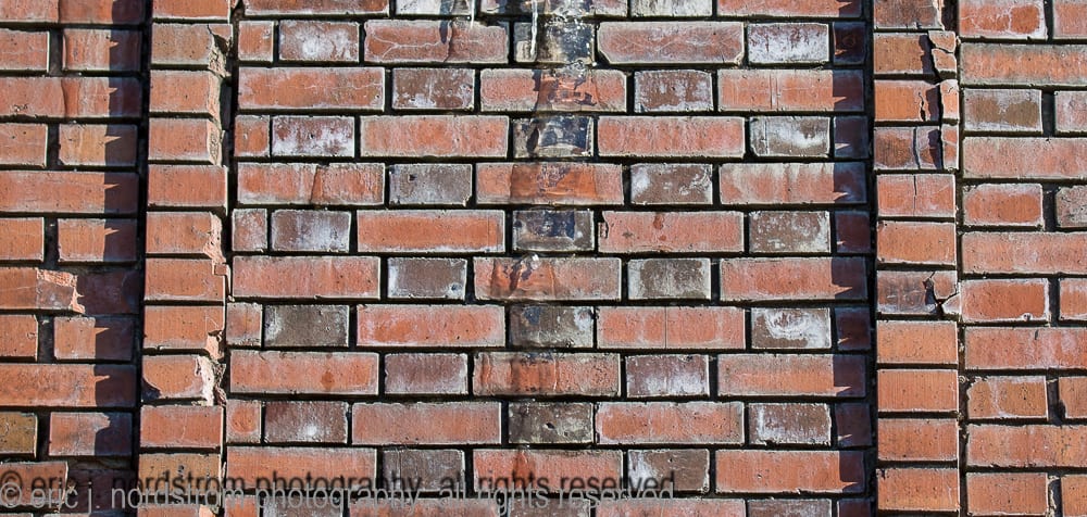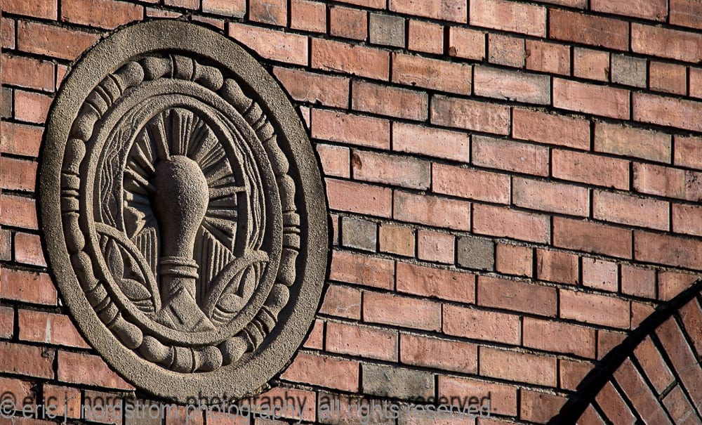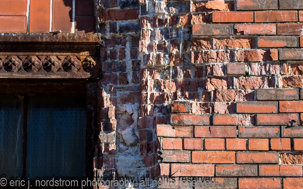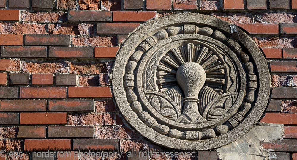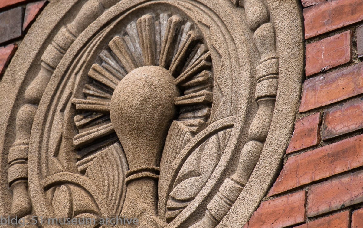moisture penetration deeply embedded in exterior walls has caused the facade to buckle in some places. spalling of face brick continues – in various degrees of severity – to spread from one end of the facade to the other. one of holst’s signature patterned tile lunettes lays in ruin on the sidewalk enclosed by fence.
