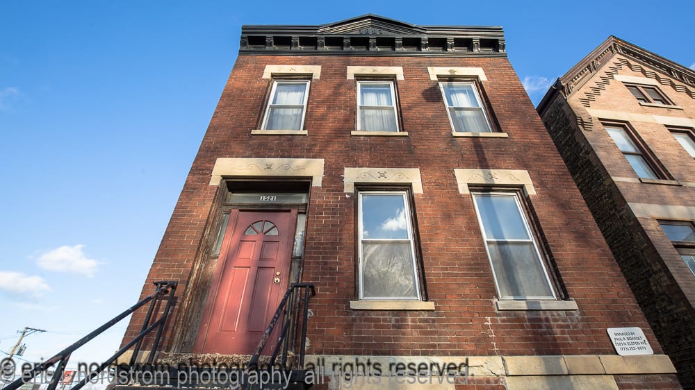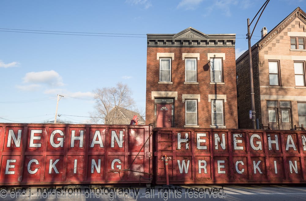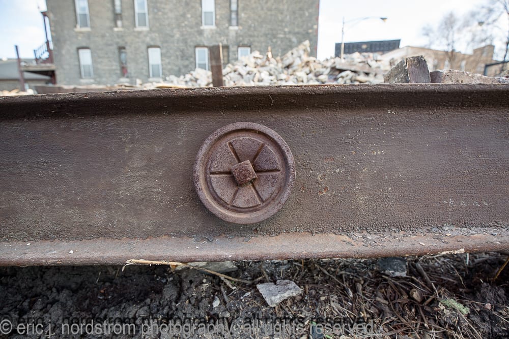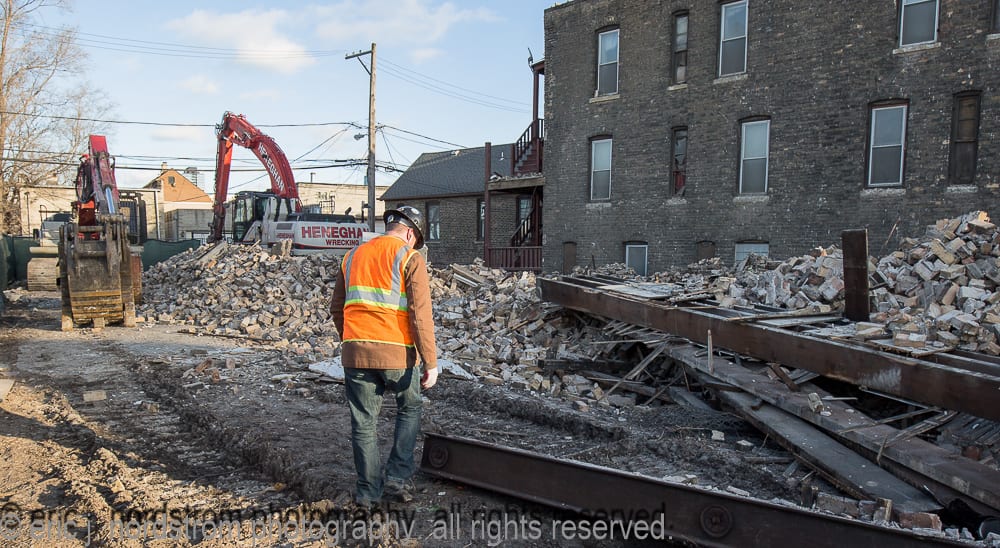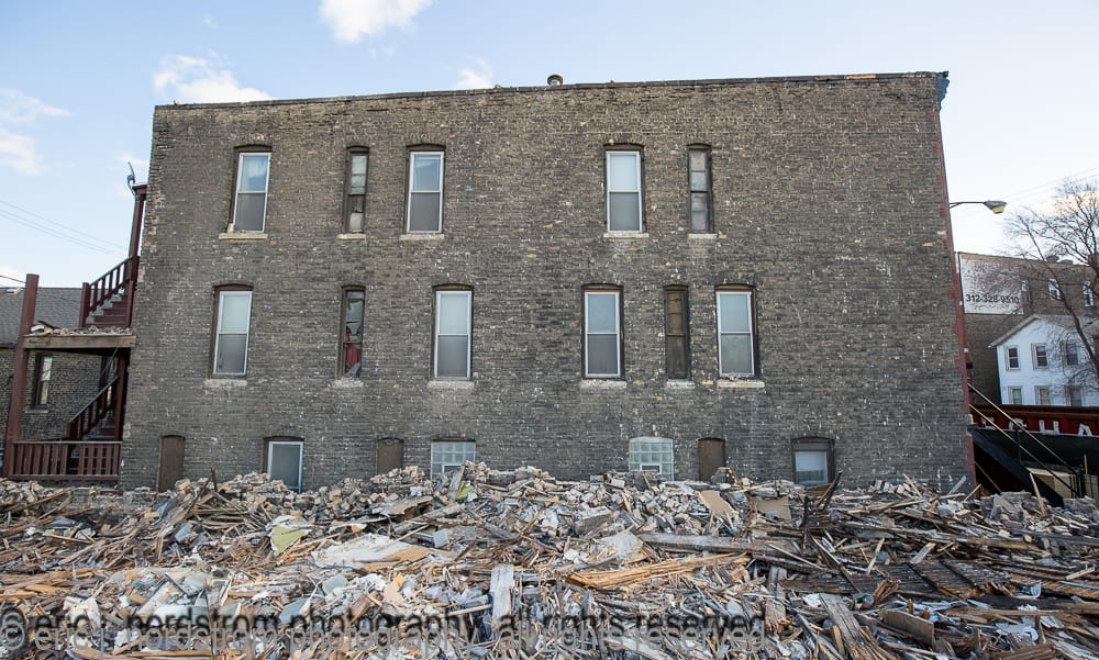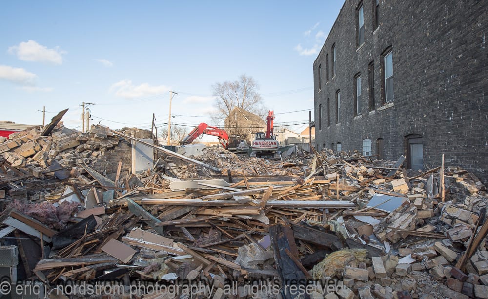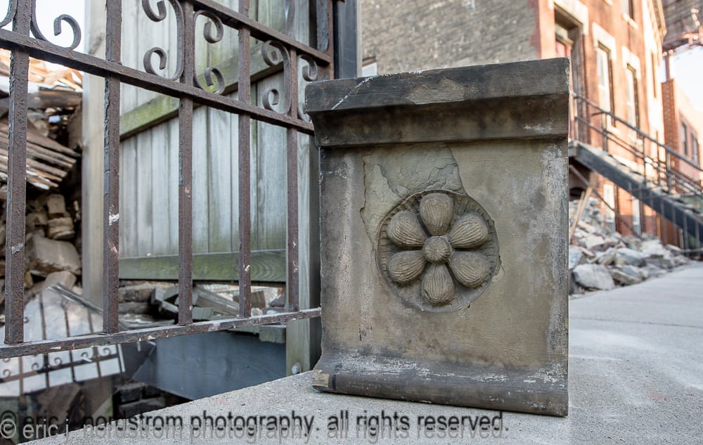 back-to-back demolition of 1880’s victorian era commercial building and adjoining residential boarding house comprised of brick accentuated with joilet limestone ornament ornament. the commercial building was especially difficult to see destroyed since it retained the original dearborn foundry “no. 2” cast iron and steel front configuration, with three-sided ornamental cast iron columns supporting a long horizontal beam with simple radial fluted anchor rosettes.