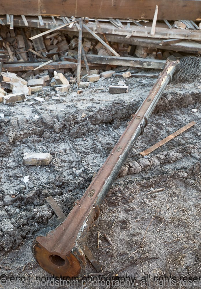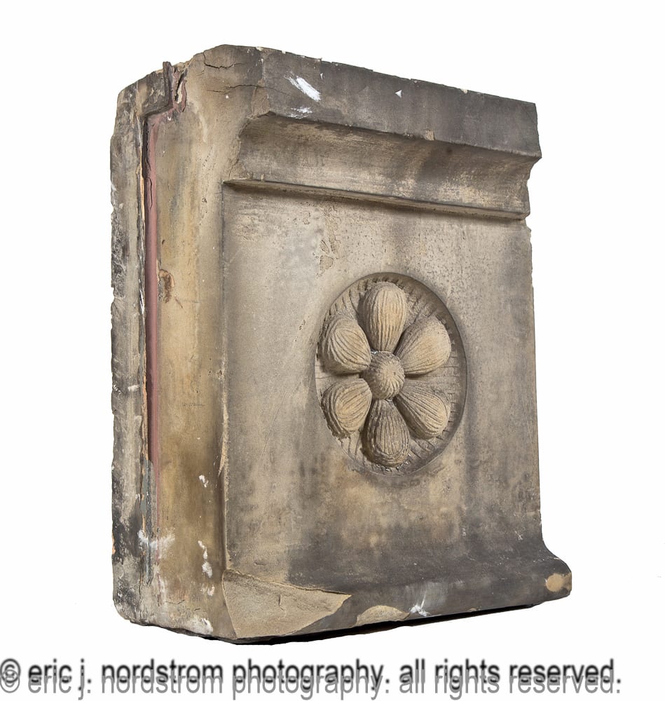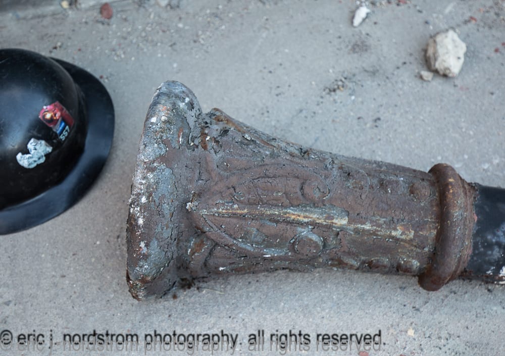 thankfully, heneghan wrecking offered me a little time to rush over and document the still-standing boarding house (note the dated 1887 pediment cornice) and salvage sections of the commercial building’s cast iron store front, including the columns flanking the main entrance and anchors with rosettes.
