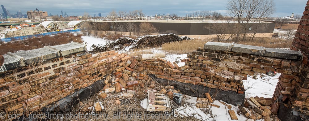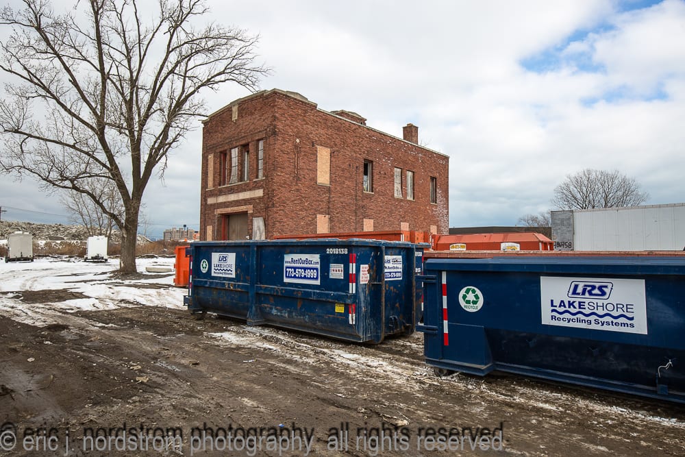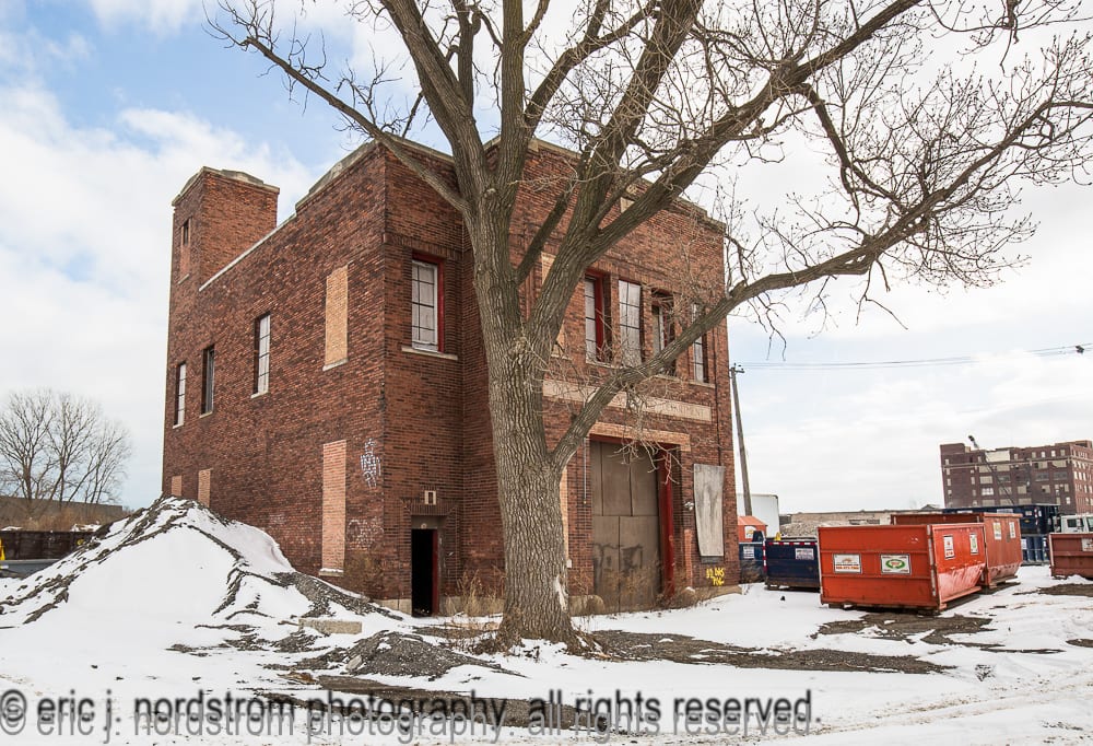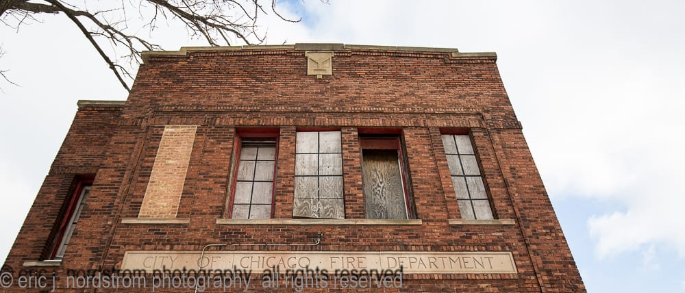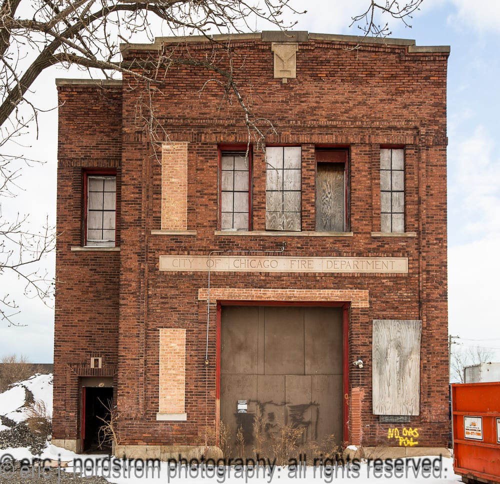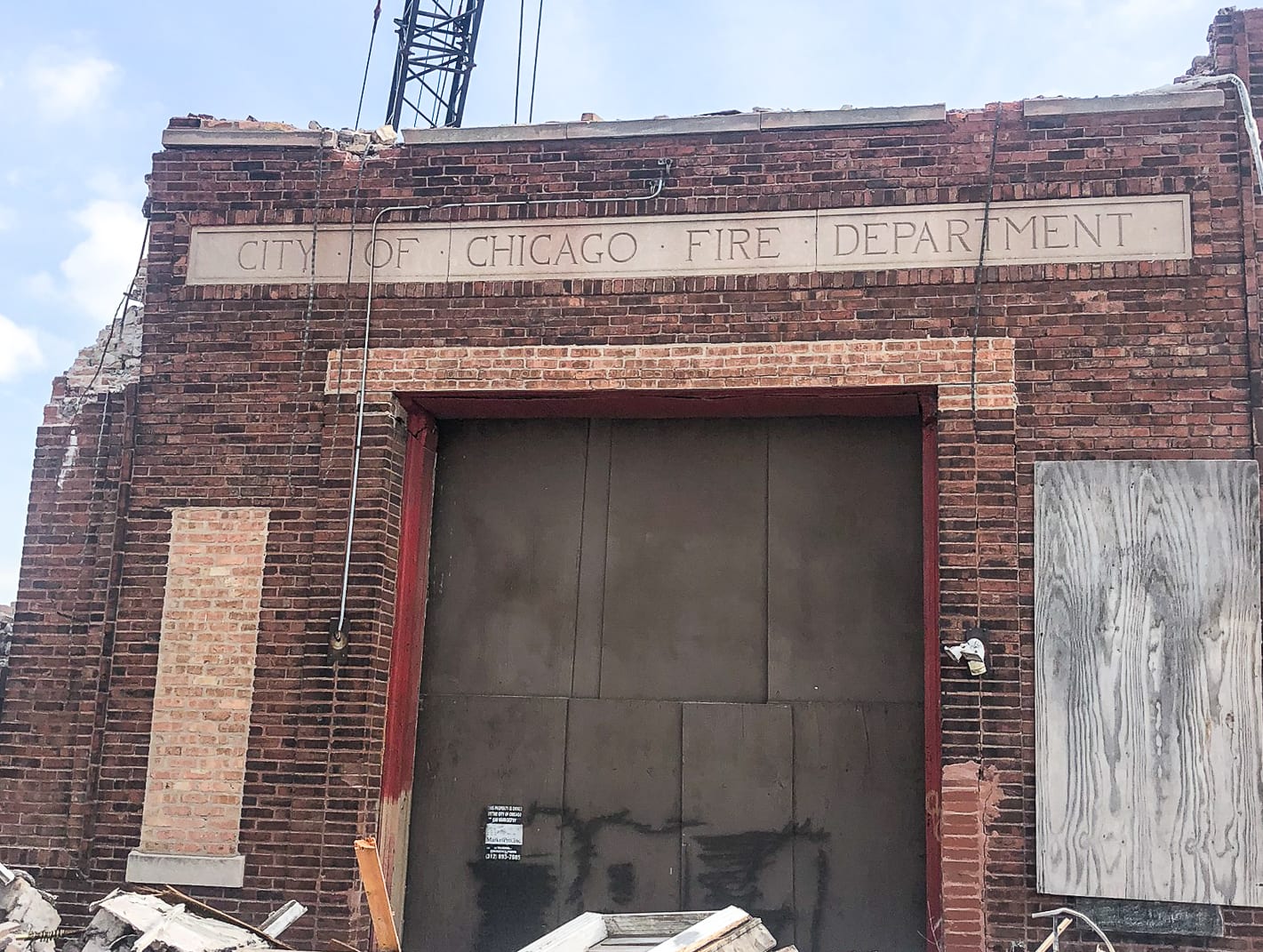 an early 20th century two-story chicago fire house (vacated in 1964) with bedford limestone incised plaque and municipal device just below the roofline, is currently undergoing demolition. the long-abandoned fire house is located in the old union stockyards, near a dumpster distribution center.
