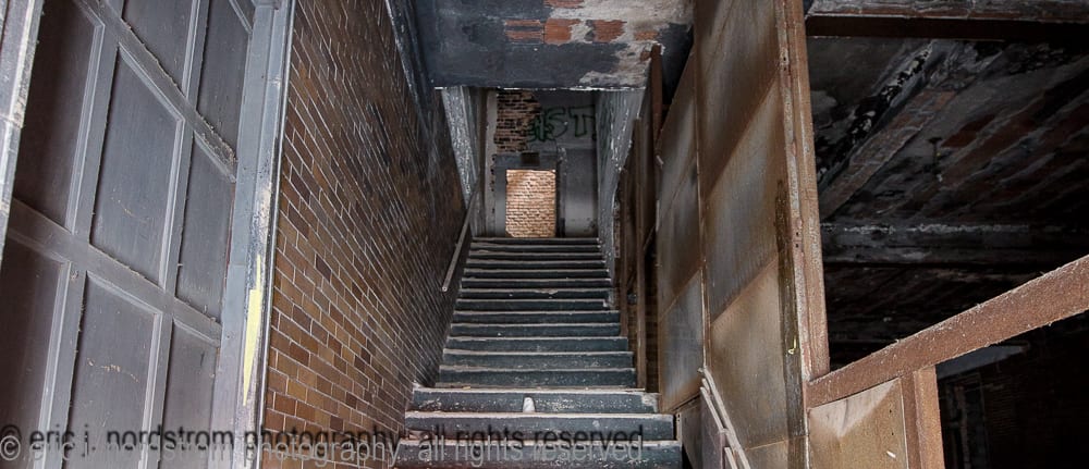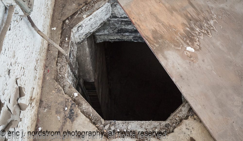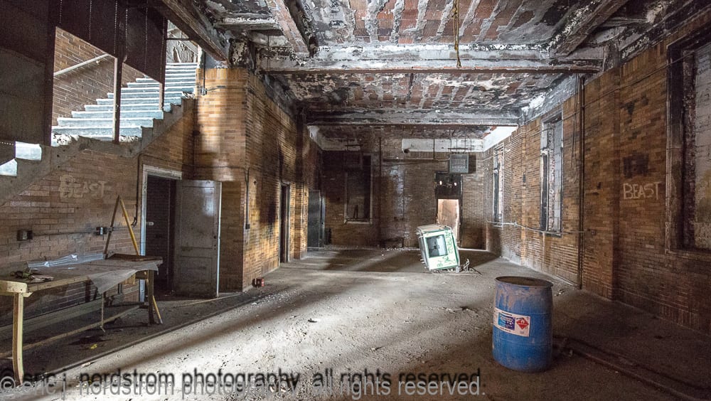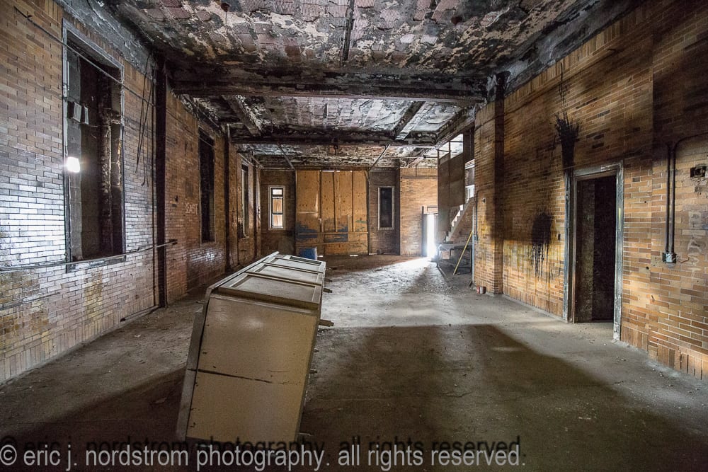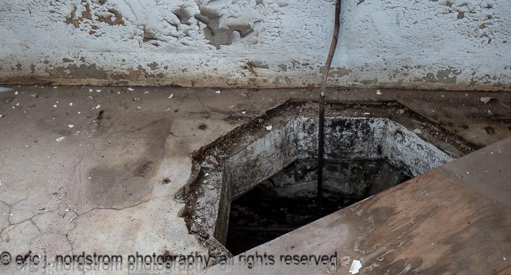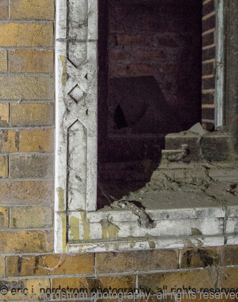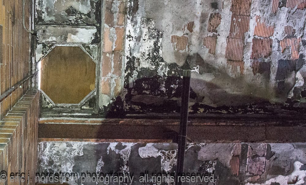 heneghan wrecking was kind enough to allow me to document both the inside and outside shortly before demolition commenced. there is some interesting ornamental white glazed terra cotta trim around the windows (interior side) and two octagonal-shaped holes punched through the second floor where the brass poles were located. the basement was flooded, so i didn’t make it down there.