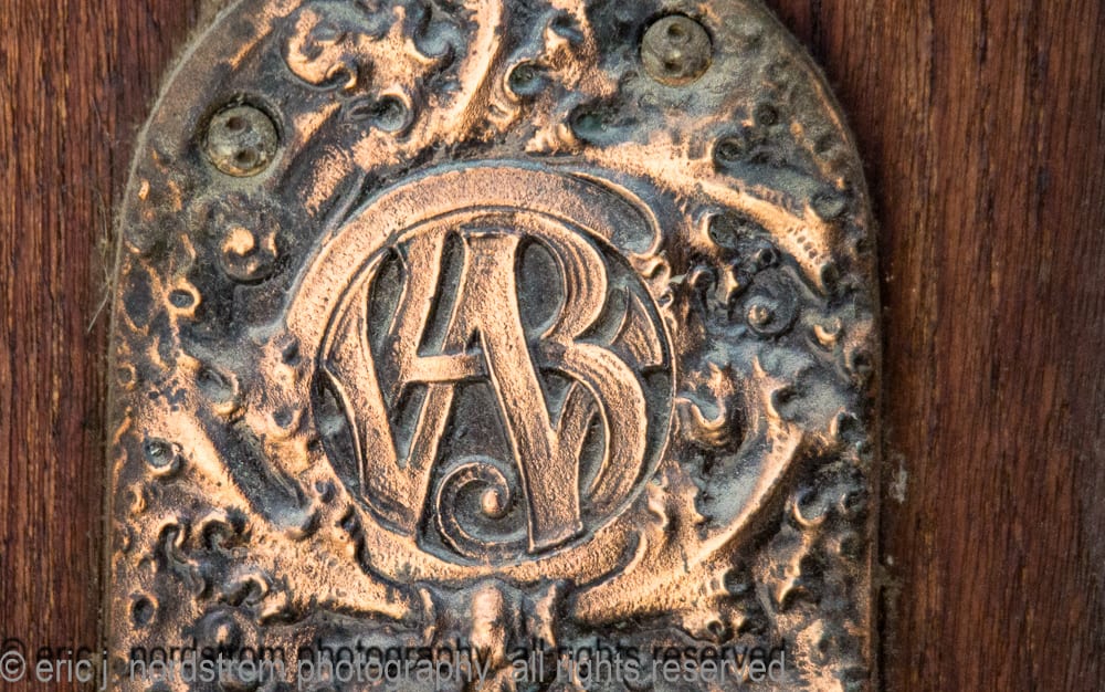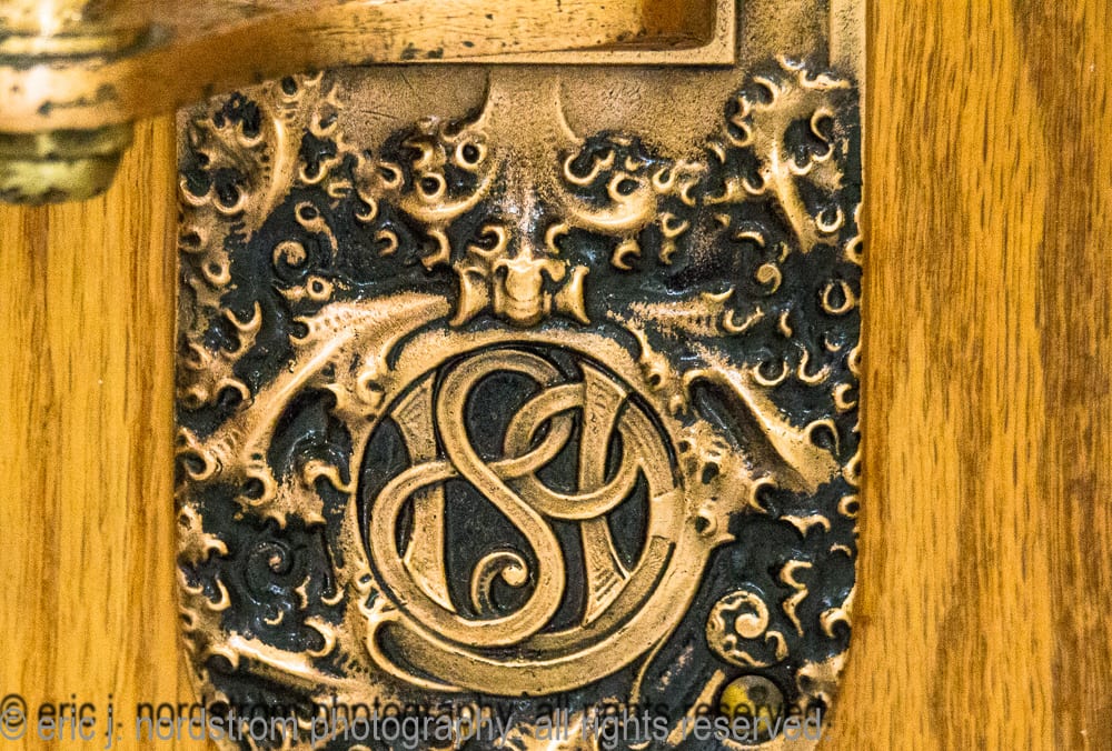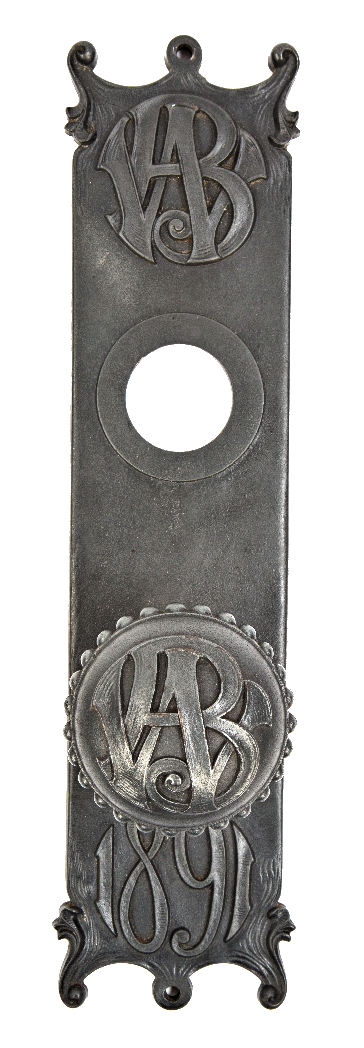 original bower-barff cast iron monogrammed interior office door backplate and matching doorknob designed by sullivan and fabricated by frequent collaborator yale & towne. courtesy of the bldg. 51 museum collection.