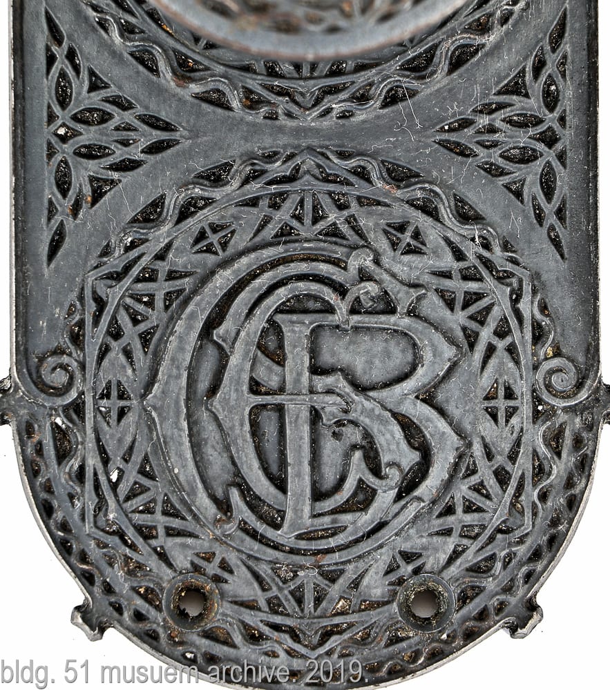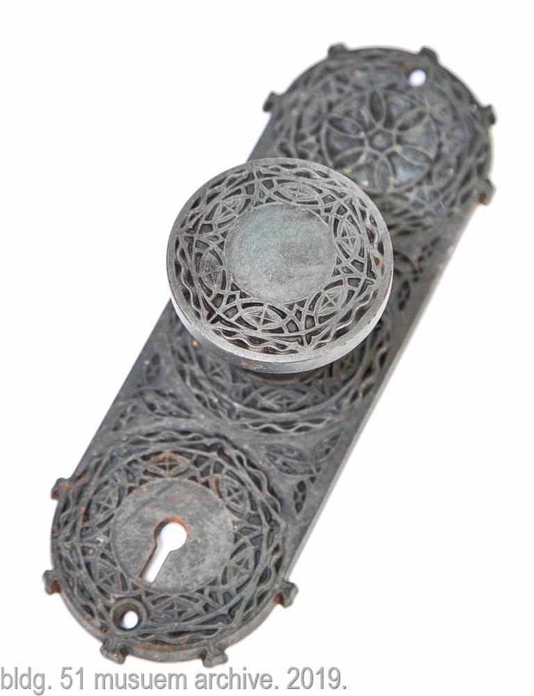 louis h. sullivan-designed chicago stock exchange building (18930 door hardware, executed by the yale & towne mfg. co., stamford, ct. the ornamental cast iron hardware retains the original bower-barff finish, consisting of a magnetic iron oxide coating applied by exposure to superheated steam.