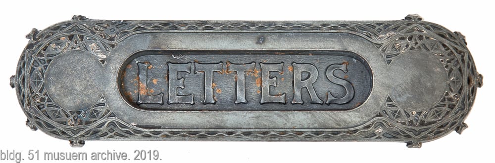 the hardware pictured, was designed for use with the building’s office, passage, utility, and swinging doors. the hinged “letters” mailslots and chutes or hoods (the latter missing), were mounted on the office doors below the panes of glass containing the name of the business. the building’s wood sash frames with massive plate glass panes, required two sash handles, mounted on opposite sides of the windows.