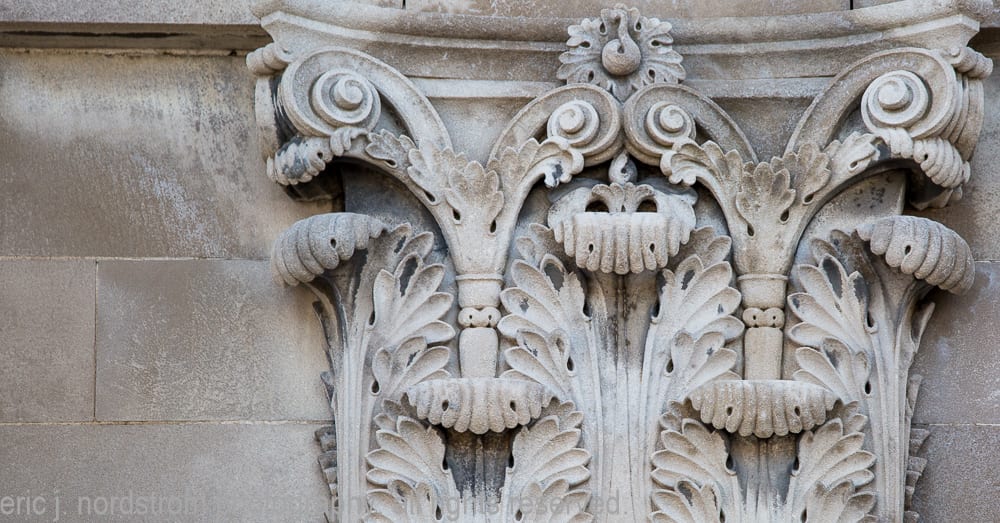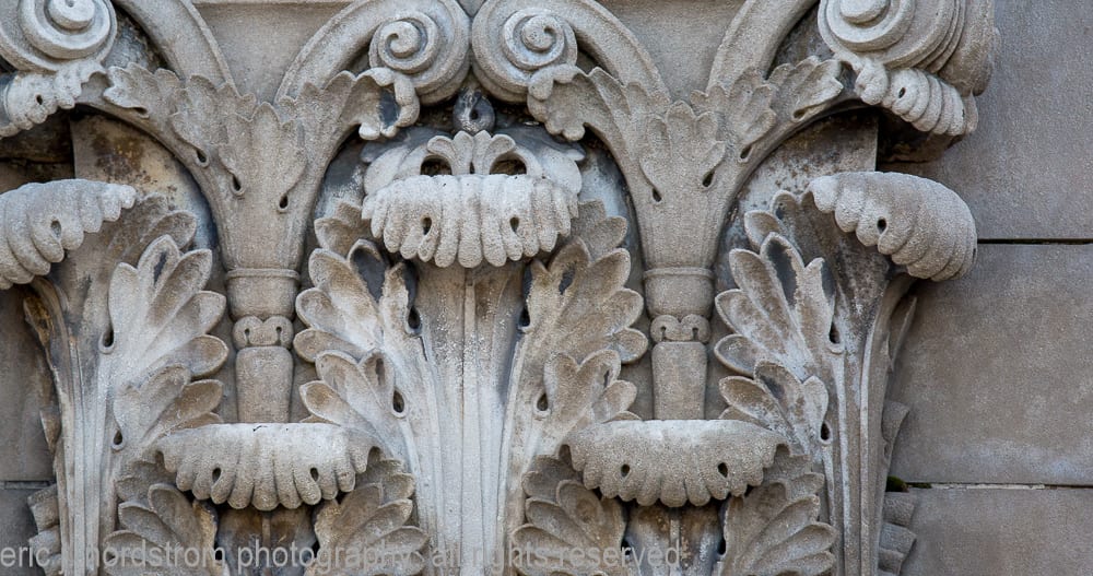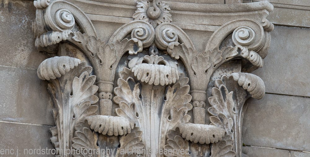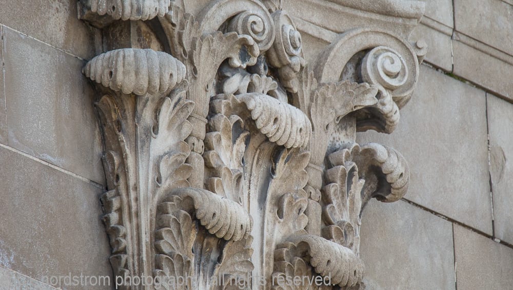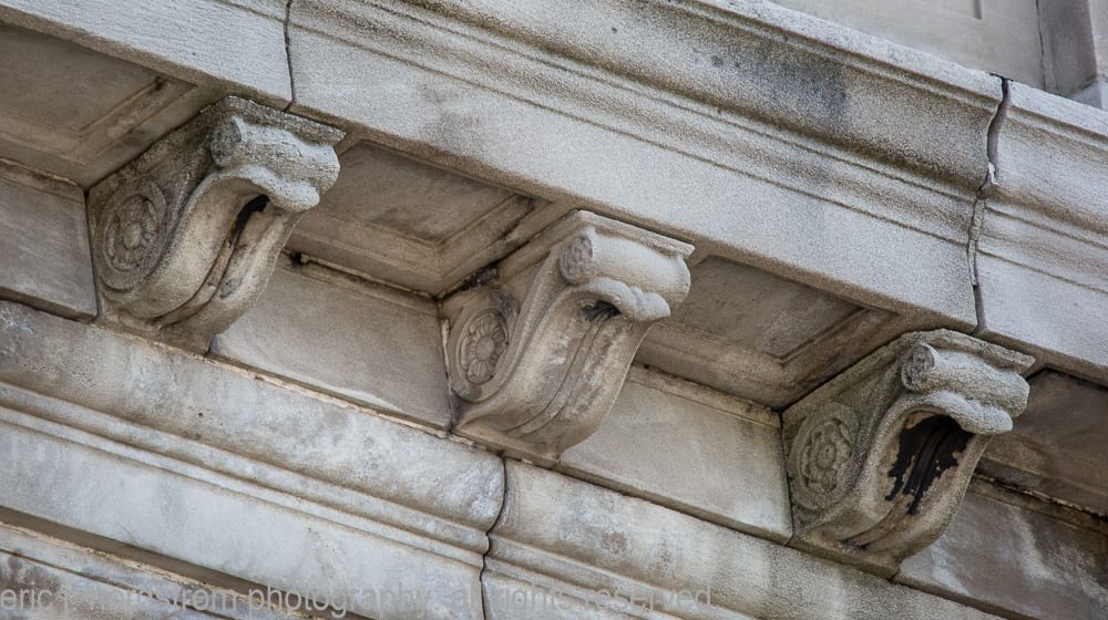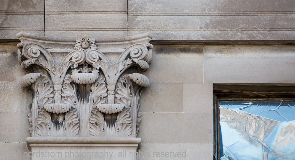 the facade is largely intact, comprised of indiana limestone – likely supplied by the bedford steam stone works. i managed to document the four matching hand-carved corinthian capitals resting atop the unadorned pilasters, bank building’s name plaque with deeply incised fanciful lettering, the cast iron spandrels accentuated with urn-shaped finials, and decorative corbels below the balustrade cornice in great detail.