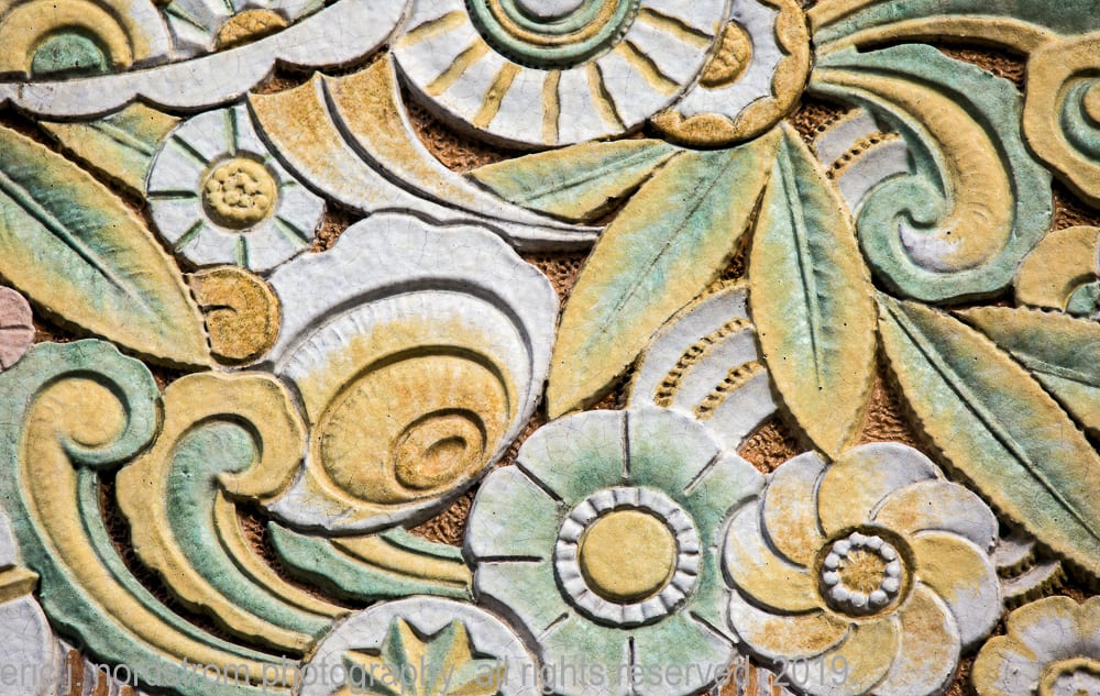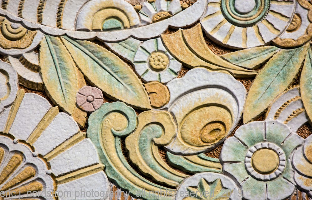fine example of art deco style polychrome terra cotta, with application of pulsichrome multi-colored sprayed-glaze finish. the exterior terra cotta panel (one of several adorning a 1920s chicago building) features stylized leafage and flowers typical of the period.