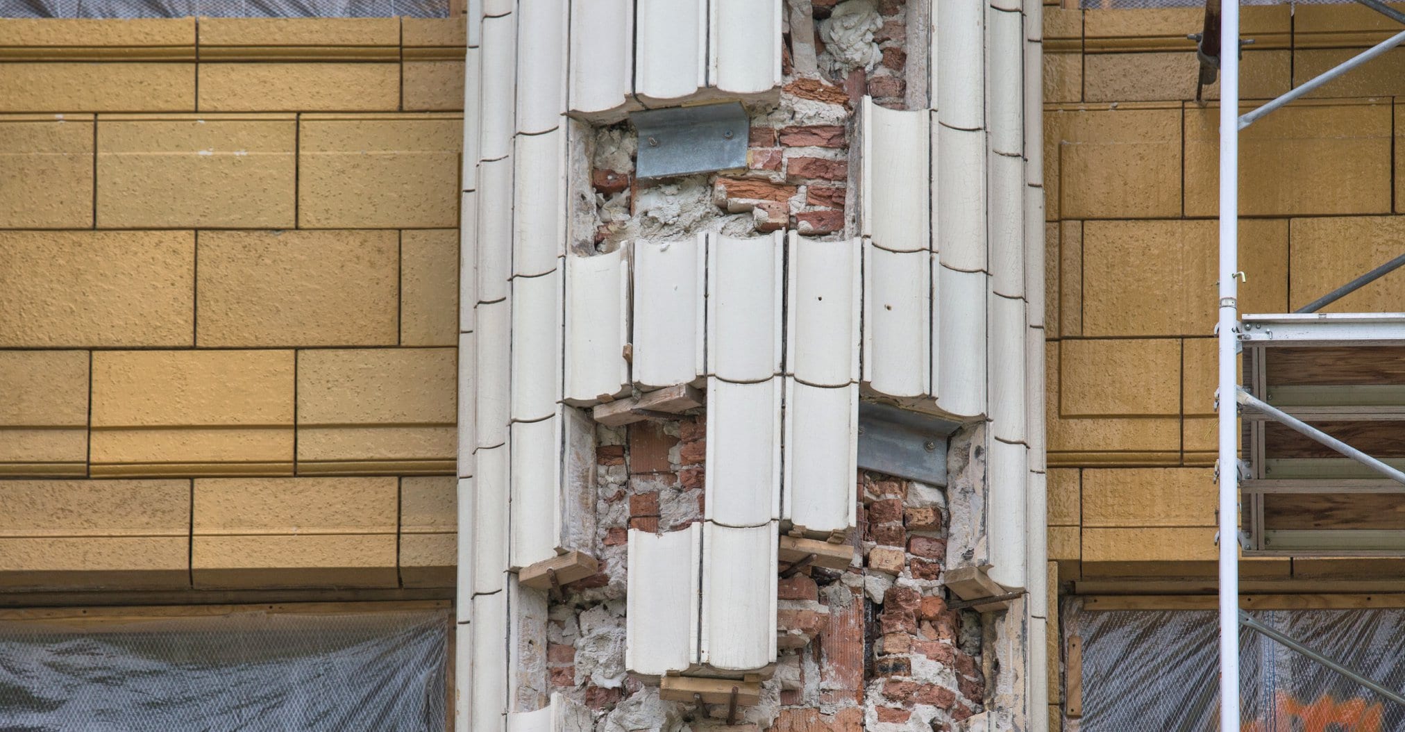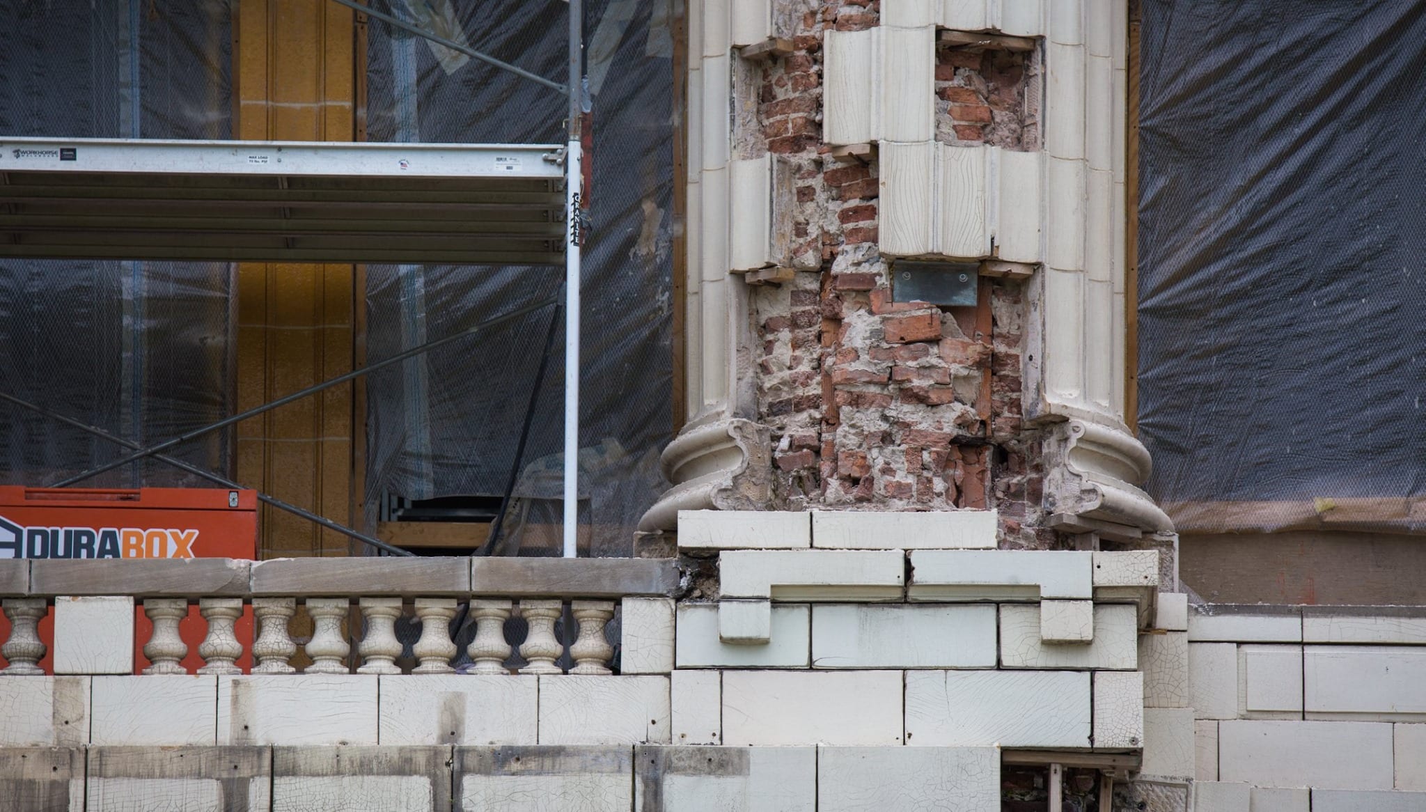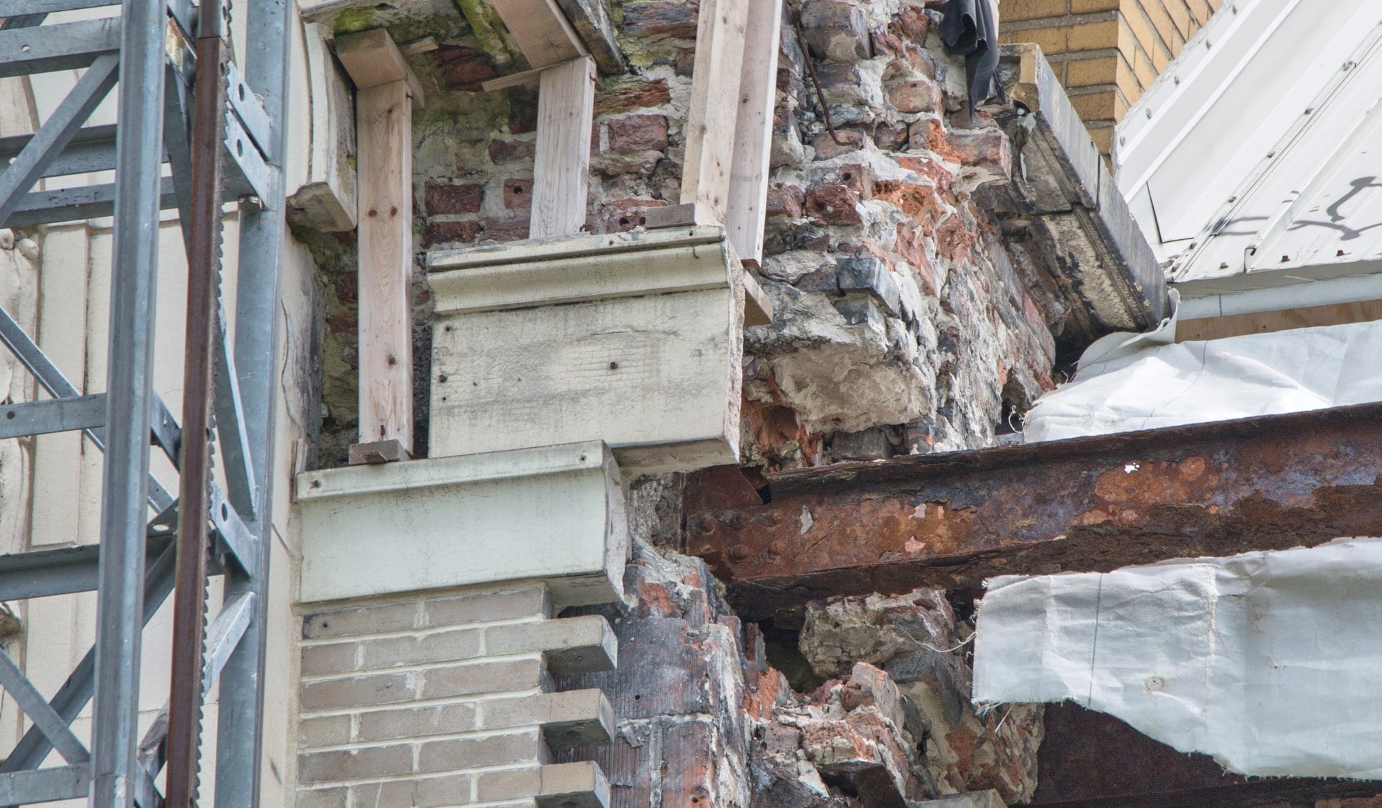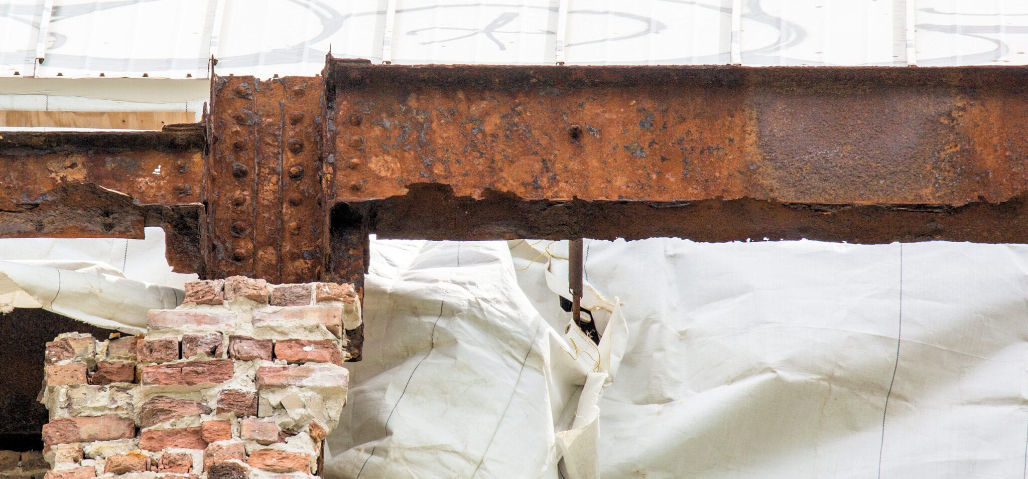 it’s clear from the images that the elements and/or deferred maintenance did a number on the structural integrity of the two segmented fluted white glazed columns, pier and heavily corroded steel beam.
