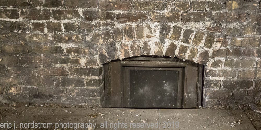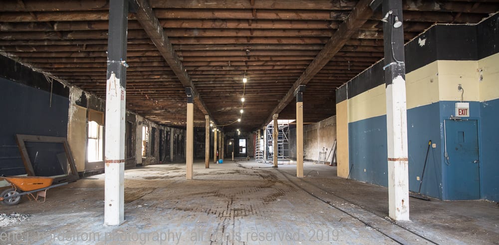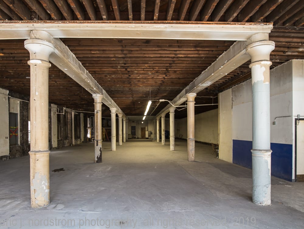 with the exception of a few oversized steel-cut plaster ceiling medallions and plaster-covered columns with incised rings and flared capitals, the interior spaces were mostly stripped down to brick walls.