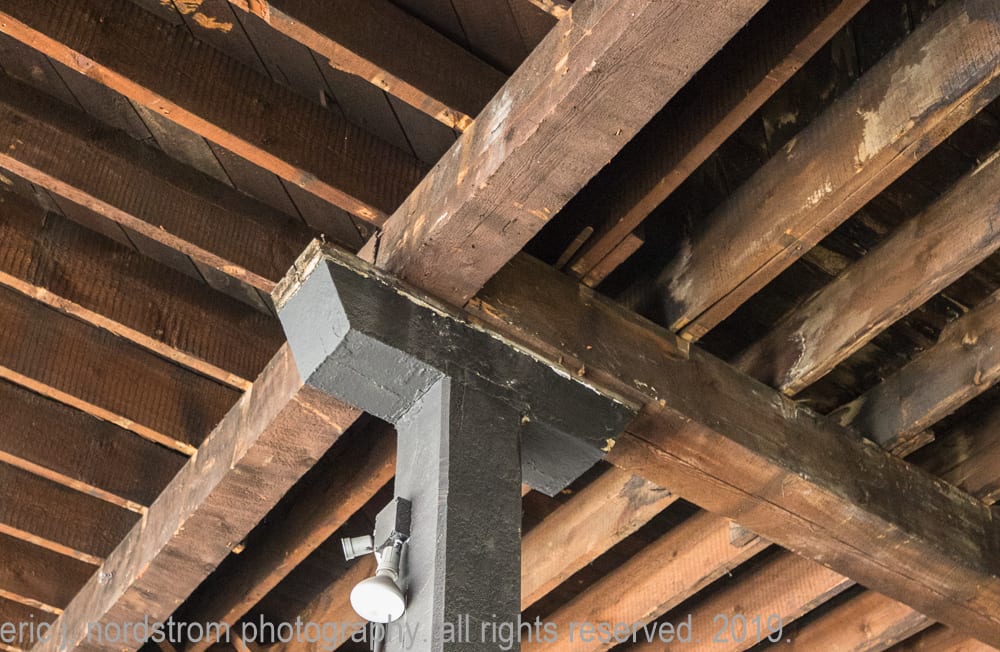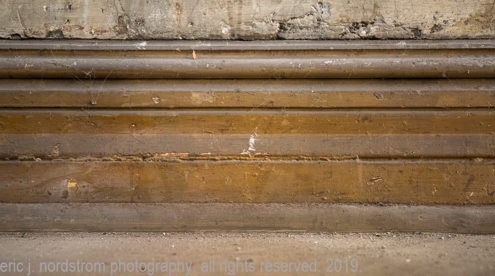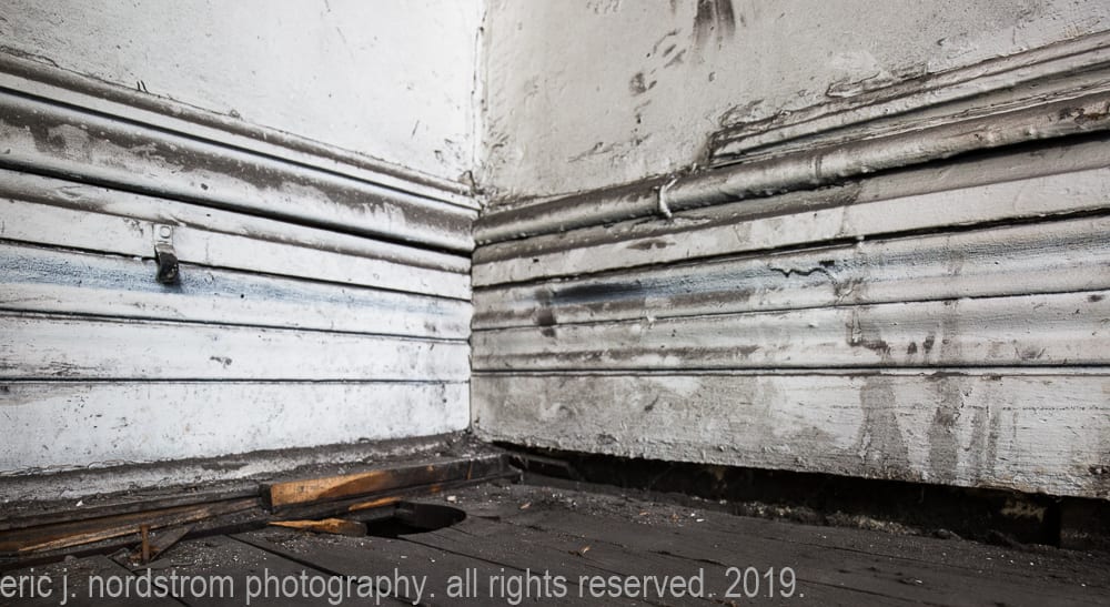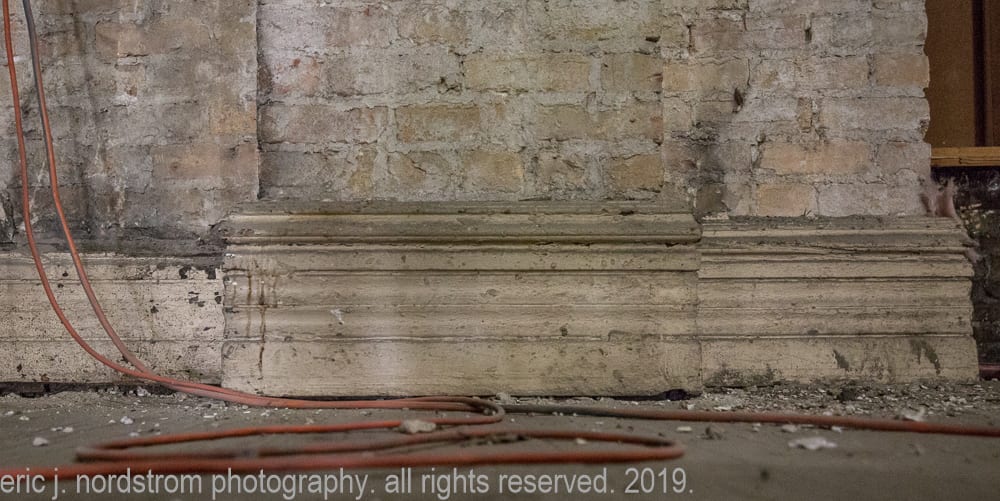 two oak wood paneled bathroom enclosures with bullseye blocks and scattered sections of original baseboard located at the back of the building near the walk-in vaults and freight elevators remain mostly intact, but i suspect it’s “stock” sourced from a chicago-based millwork company.