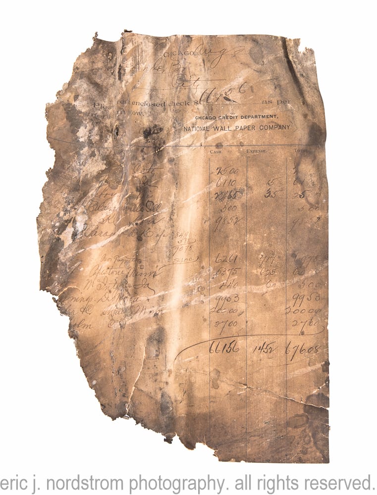 while documenting the upper floors as workers cleared any and all debris in preparation for constructing hotel rooms, i gravitated towards several wall openings and spaces once concealed by baseboard along the wood floors. i was pleasantly surprised to find bits and pieces representing past tenants, including 19th century ephemera (e.g., invoices, order sheets, tags, etc.) from the building’s first tenant s.a. maxwell and company, who specialized in wallpaper and stationary with showroom on the first floor and offices and storage located on the upper floors. i hope to return again soon to look more closely for additional material that may provide valuable insight into the daily operations from its many occupants since the time the building was completed in 1881.