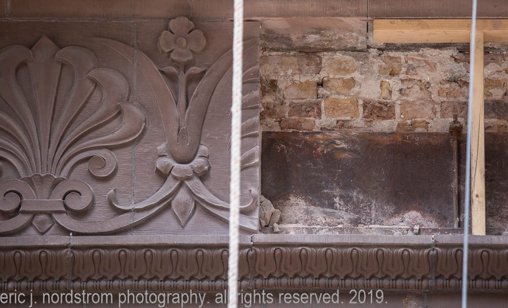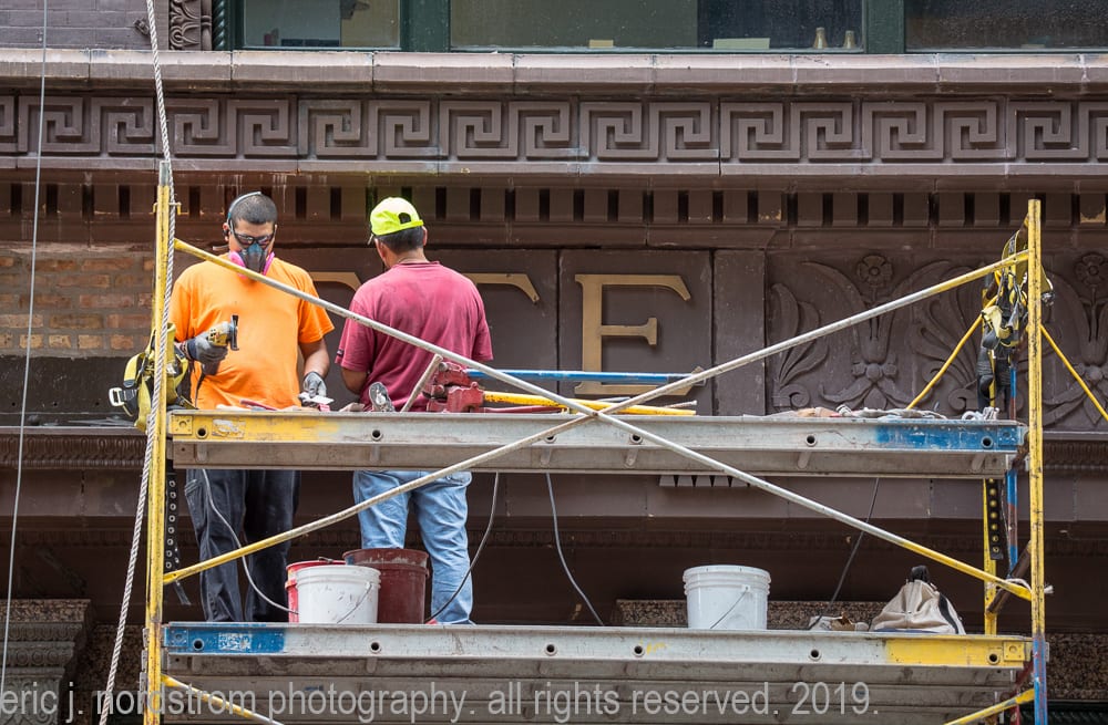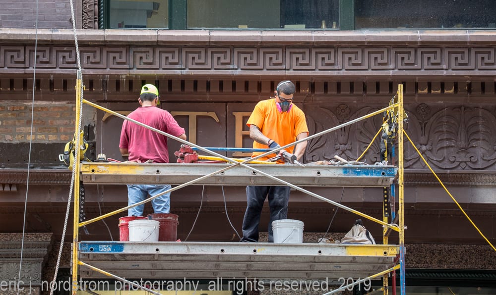 architectural restorations provide a great opportunity to see how historic chicago buildings are being altered or preserved. the seemingly routine work happening behind scaffolding should attract in-depth attention from the public, as restorations are more than just a shift in commercial occupants, they are ambitious processes meriting up-close documentation. transition points may let us understand a building’s life story and evolution, and archive those changes for the future.