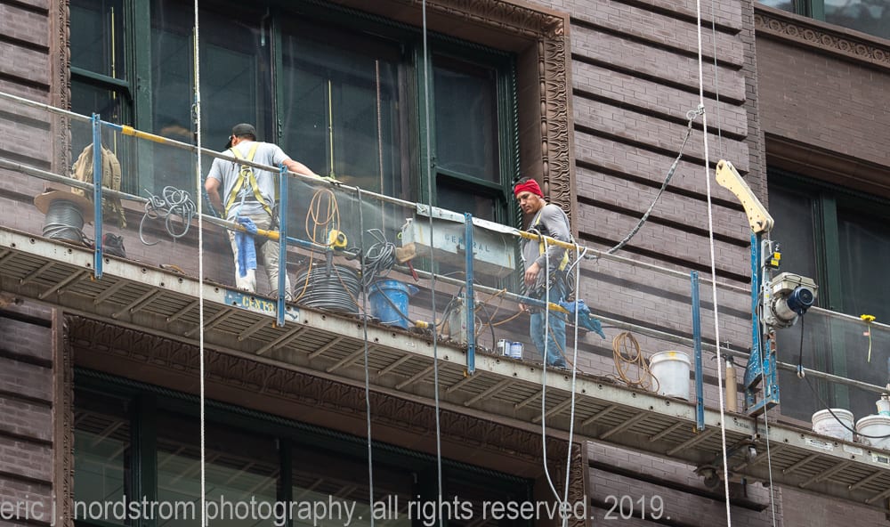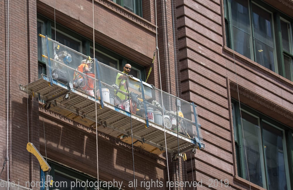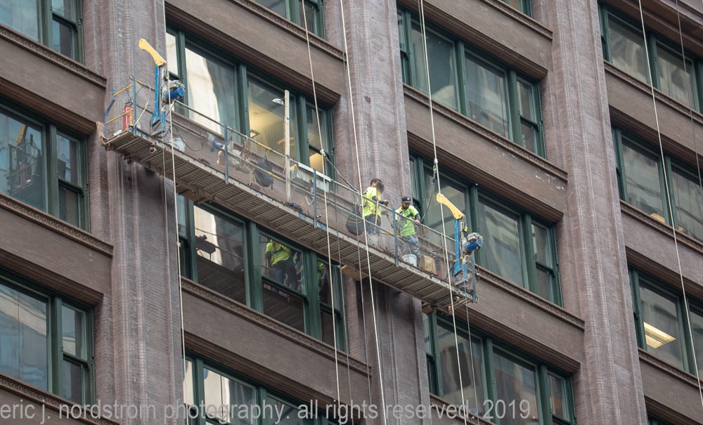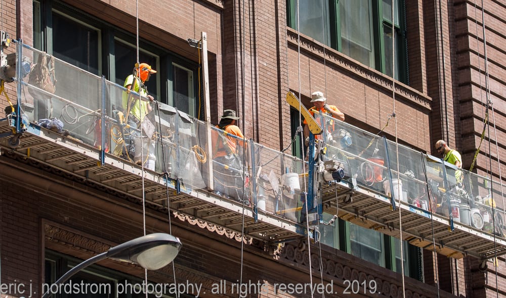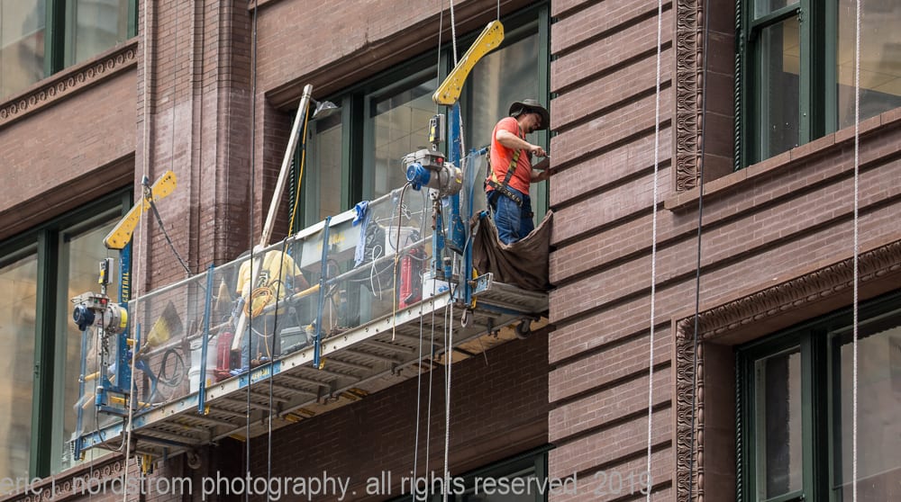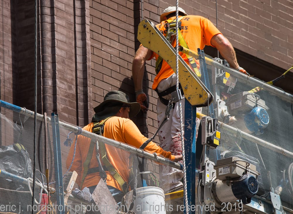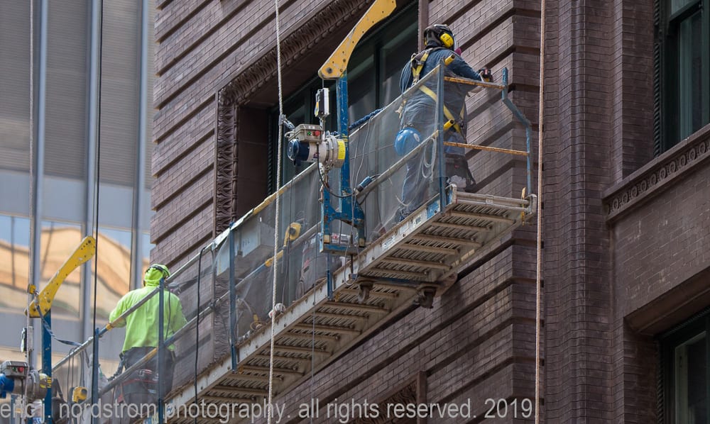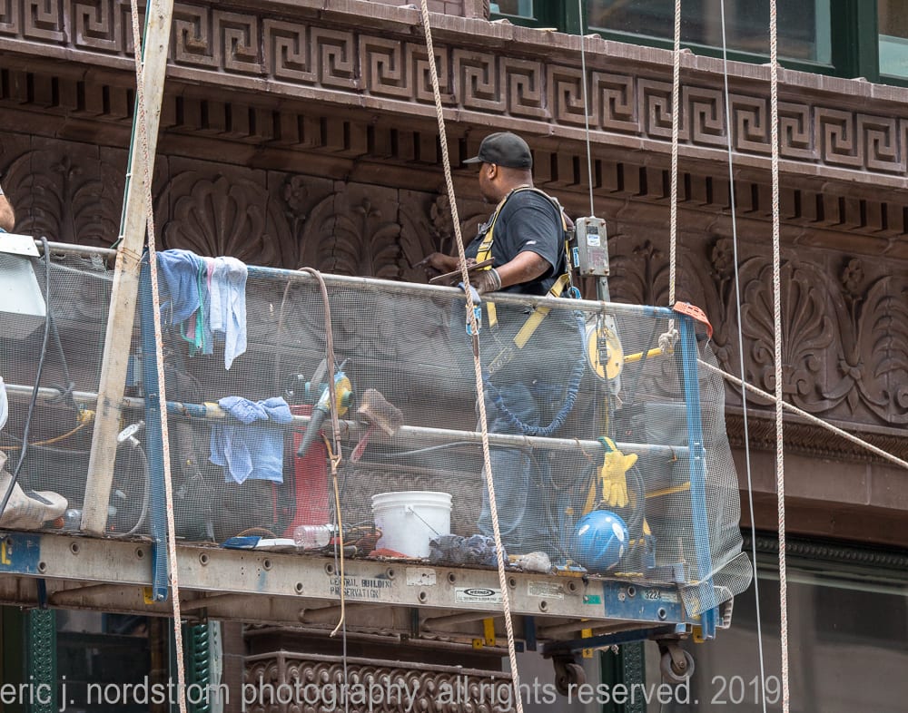 august 4th, 2019: marquette building facelift. i’ve repeatedly visited holabird and roche’s marquette building (1895) over the past few months, documenting restoration work on the facade. the latest images show workers on swing stages repointing masonry joints.